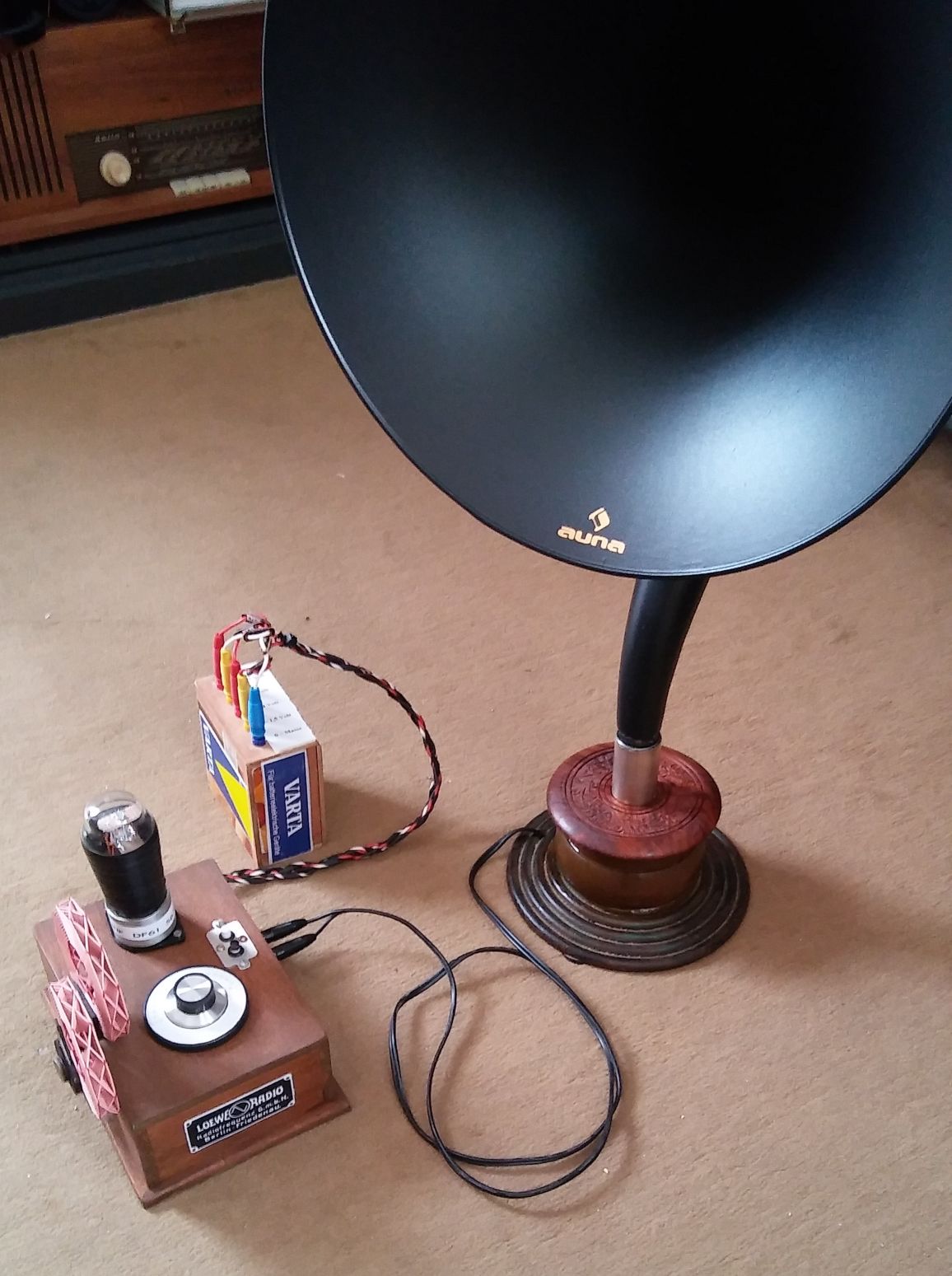 Das Gehäuse ist aus Zedernholz gefertigt und hat den Großteil der Zeit gekostet. Es handelt sich um verklebte Teile mehrerer Zigarrenkisten aus dem Jahr 1956, die mein Opa wohl gepafft hat. Auf dem Foto kann man auf der Batteriebox noch den Preis 15 DM (für 25 Stück!) erkennen. Wirklich alt und aus den 1920'ern sind die Messingnägelchen für die Schildchen.