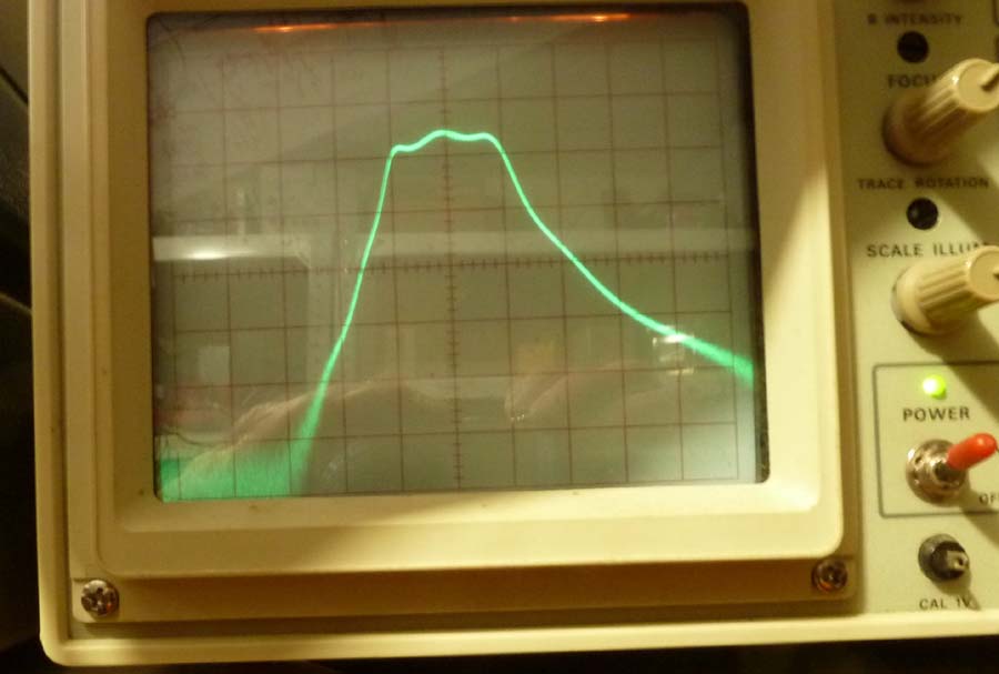Die Schaltung ist als PDF angehängt. Die Antenne kommt an K1, ideal ist eine KW-Antenne mit 50 Impedanz, ein paar Meter Draht geht aber auch, je nach Anspruch an die Empfangsqualität. Die Spulen L5, L6 und L7 bilden ein dreikreisiges Bandfilter. Ich habe hier normale axiale HF-Induktivitäten verwendet, die stehend mit etwa 3mm Abstand zueinander montiert sind, dadurch koppeln sie induktiv. Durch Biegen kann die Kopplung und damit die Filterkurve optimiert werden. Hier die Messung (1MHz/Div und 10dB/Div, die Mittenfrequenz ist 10MHz):