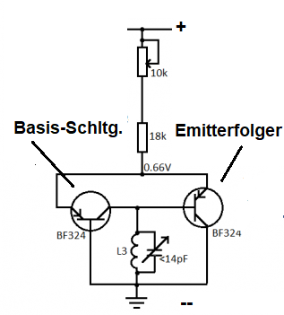 ...wir hatten den Oszillator schon mal hier, KW und MW Audion, Friedrich Kutnik: http://www.wumpus-gollum-forum.de/forum/...&thread=177 Ich war auch erstaunt und habe gefallen an der Schaltung gefunden. Zur Zeit ist sie im Einsatz (auch 2 pnp Transistoren, Masse an Minus) bei 500 kHz für Testmessungen der Hand- und Antennenkapazität eines Theremins. Jan