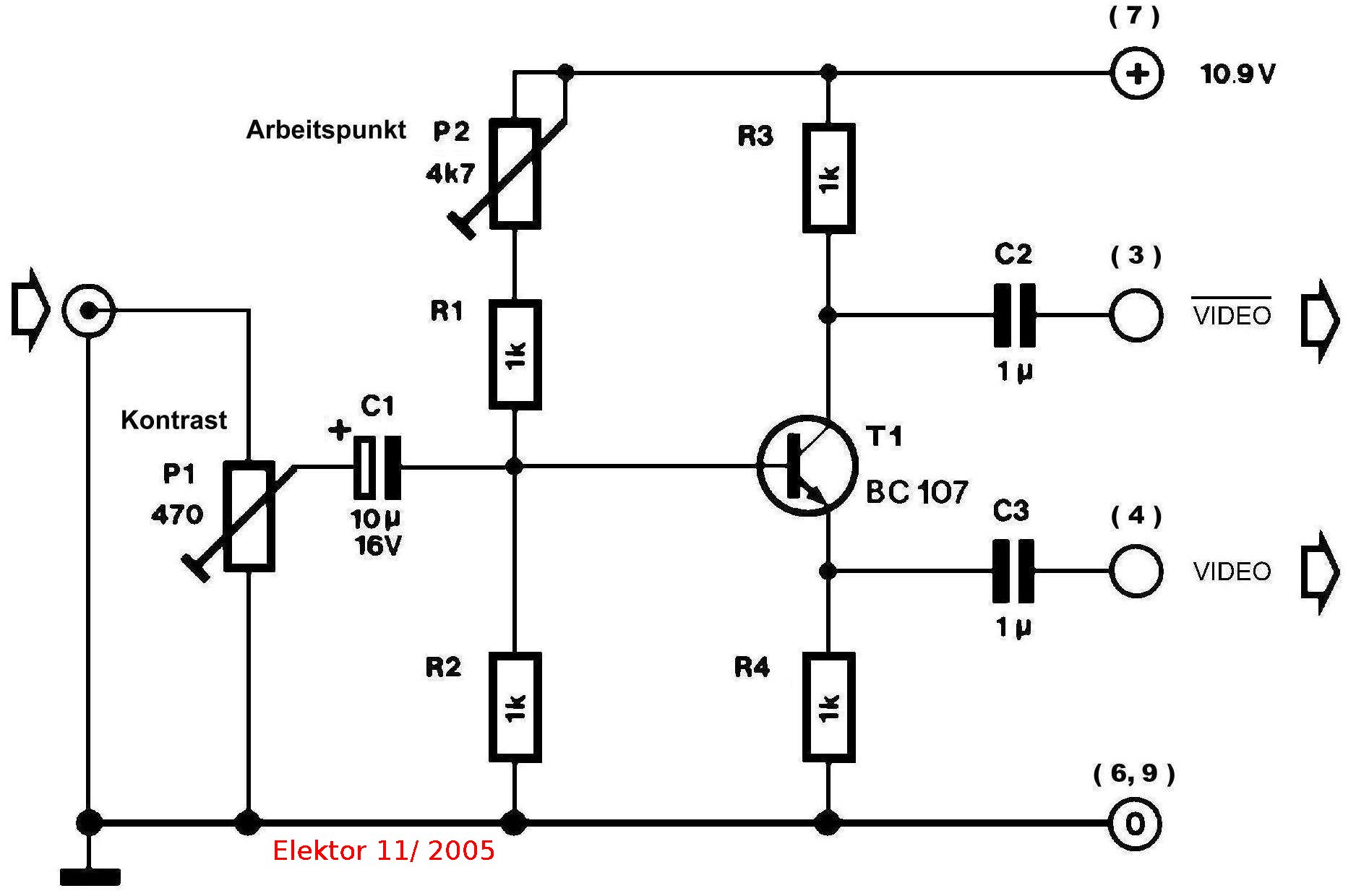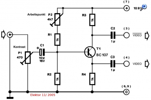 Zur Erzeugung eines negierten VIDEO-Signals wird ein Videoverstärker (Quelle: siehe Schaltplan) benötigt: