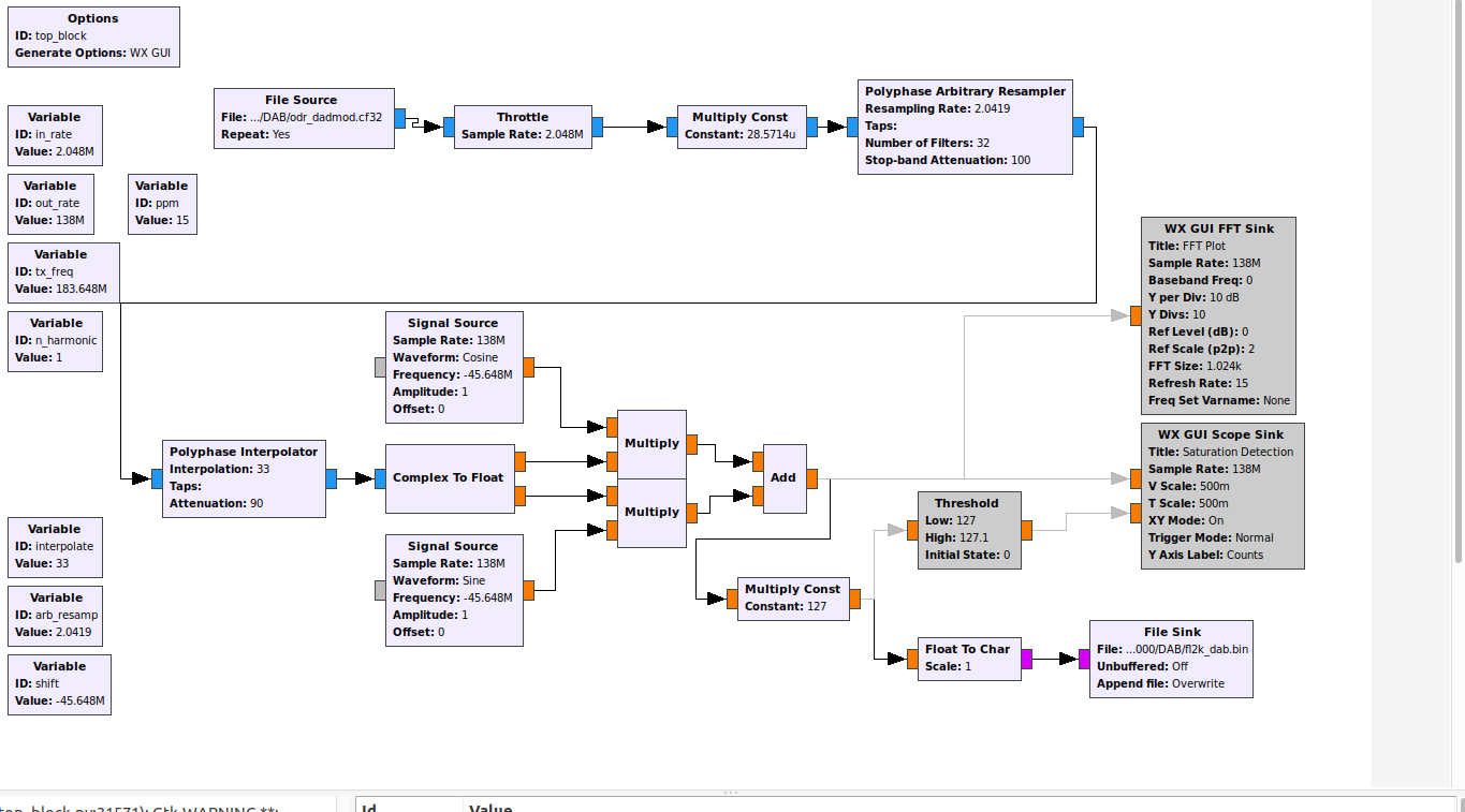 Links im Grafenbild, in der Variablen "out_rate" wählt man die Samplerate, mit der die HF-Datei nachher auch in den DAC geschrieben werden soll. Schnelle PCs machen das locker mit den angegeben 138 MS in Echtzeit. Langsame PCs können hier aber auch 10 MS angeben, wir reiten mit dem DAC ja sowieso auf den Oberwellen. In der Variablen "tx_freq" geben wir noch die Sendefrequenz an, mit 183.648 MHz landen wir also im DAB-Kanal 6B.