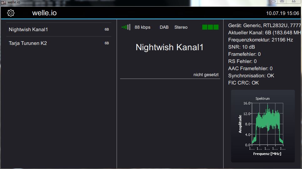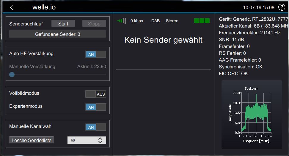 Nachdem die Daten nun in Echtzeit zum DAC übertragen werden, ist unser DAB-Sender bereits onAir. Wir können dies mit einem DAB+ Radio, abgestimmt auf Kanal 6B, überprüfen. Wer kein DAB+ Radio zur Hand hat, dafür einen billigen 10 Euro DAB-Stick, kann dies zum Beispiel mit dem Softwareradio Welle.io machen.
