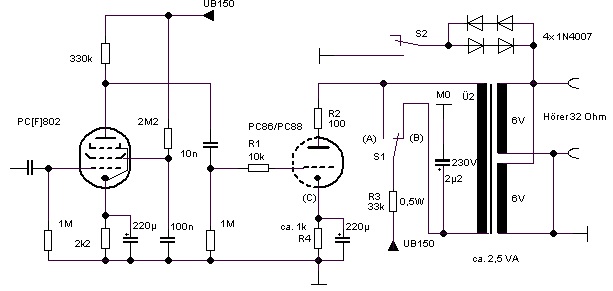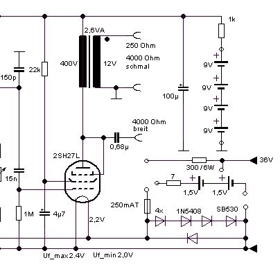 150 Volt braucht man nicht unbedingt, 80 Volt reichen auch noch aus. Es wurden typische "Bastelröhren" verwendet, darüber ein eigener Thread an dieser Stelle: https://www.wumpus-gollum-forum.de/forum...=298&page=4 - "Scotty, wir brauchen mehr Power", geht aber auch mit größerem Kernschnitt: Als Triode geschaltet, gibt die Endpentode auch mehr Schub im unteren Bereich. - Für Batterieröhren ist die Primärinduktivität des 230V-Printtrafos etwas gering, bessere Tiefen ergibt ein für 400V gewickelter Trafo, da er doppelte Windungszahl besitzt: Man kann auch mit Erfolg 2 dieser kleinen 230V-Printtrafos in Serie schalten, - Für das DL651-Hybrid-Audion mit Germanium-Transistoren https://www.wumpus-gollum-forum.de/forum...=461&page=1 wird diese Schaltung als Vorbild dienen: Der Transistor kann weiter aussteuern als die Röhren, 9V Betriebsspannung reichen deshalb.