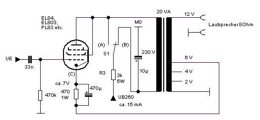 die ECC88 (PCC88) eignet sich auch sehr gut als Endstufe, insbesondere für niedrigere Betriebsspannungen bis 100V. Die zweite Triode kann als NF-Vorstufe verwendet werden. Dabei ist zu beachten, dass die zulässige Anodenspannung im betriebswarmen Zustand bei 120V liegt, weil die Röhre für Kaskondenverstärker gebaut wurde. Neue Röhren sowie die E88CC vertragen bis 250V Anodenspannung, dabei sind Ausgangsleistungen bis 0.5W möglich, also auch komfortabler Lautsprecherbetrieb.