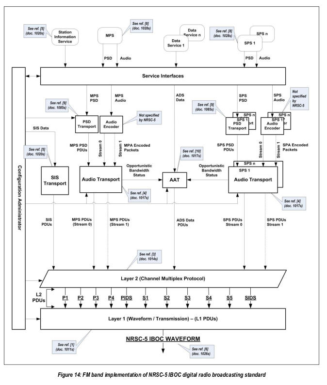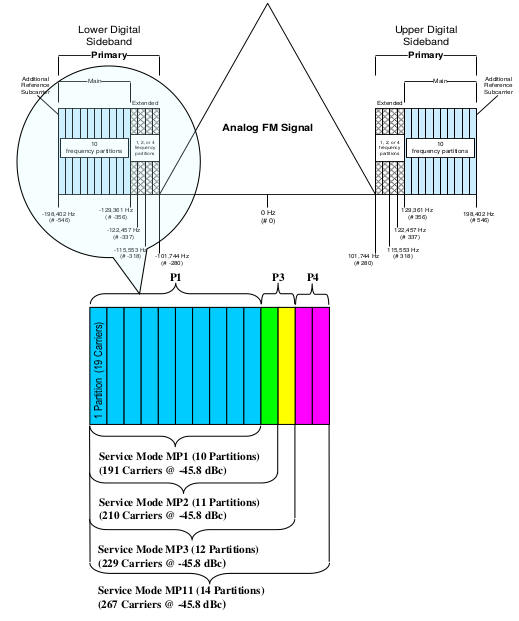 Mehrere Radioprogramme (oder Audiospuren) werden nach einem Audioprozessing mit besagtem modifizierten AAC+ Codec und weiteren programmbegleitenden Informationen als Services in einem zwei Layer umfassenden Stack zu einem OFDM-Signal umgeformt. Der HD1-Service, also das erste Digitale Programm entspricht in einem Hybrid-Signal der digitalen Version des analogen Signals, welches für ältere analoge Rundfunkempfänger mitgesendet wird. Das analoge Signal wird dabei so verzögert, das es Empfängerseitig beim Umschalten von Analog auf Digital nicht zu "zu hässlichen" Umschalteffekten und damit Informationsverlust kommt. Wer die Analog-Digital-Umschaltung in einem einfachen DAB+ Audioradio gehört hat, der weiß was damit gemeint ist. Das OFDM-Signal wird dem normalen Analog Signal einfach aufaddiert, was einen einfachen und kostengünstigen Upgrade alter Sendeanlagen möglich macht. Die Firma iBiquity als "Erfinder" dieser Norm bietet den Radiostationen dafür preisgünstige Expanderboxen an, das Geld wird erst mit den Lizenzen für die HD-Services gemacht! Jeder HD-Service kostet der Radiostation nämlich eine Gebühr! Verpflichten ist im Hybridsignal die Ausstrahlung von HD1, also der digitalen Version des analogen UKW-Signals. Gegen geringere Gebühr ist dann das weitere Aussenden von zusätzlichen Programmen als HD2-4 Service in geringerer Audioqualität möglich. Mit Stand 2018 gab es nach der FCC in Amerika 2200 Sendelizenzen für HD-Radio-Signale, wobei 1950 wirklich on-Air mit mindestens HD1 sind, 1458 Radiostationen bieten einen HD2-Kanal, 470 ein drittes HD3-Programm und nur 72 Stationen senden in der teuersten Variante HD4 mit 4 Digitalradioprogrammen pro UKW-Frequenz.