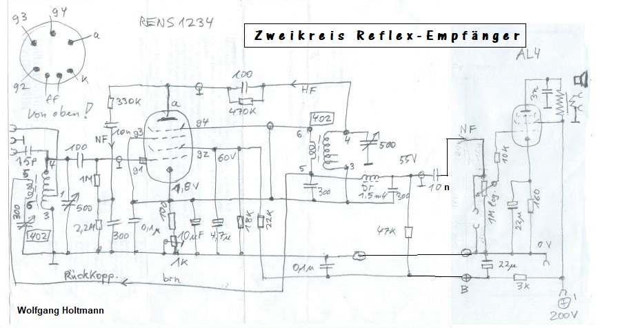 Die Besonderheit liegt in der verwendeten Röhre: Die Hexode RENS1234 von TELEFUNKEN. In der untenstehenden Zeichnung wird HF zunächst verstärkt, wobei g4 als Anode fungiert. Nach der doppelten Selektion gelangt die HF zur Gleichrichtung an die eigentliche Anode! Über die Reihenschaltung 330k und 10n wird die NF zum g1 zurückgeführt und erscheint jetzt verstärkt am Fußpunkt (5) des 2. Kreises. Von hier läuft ein Draht zum Eingangskreis und bildet den Rückkopplungszweig. Zur Unterdrückung der HF-Restanteile dient die eingeschleifte Drossel, dann geht’s zur NF-Endstufe mit der AL4.