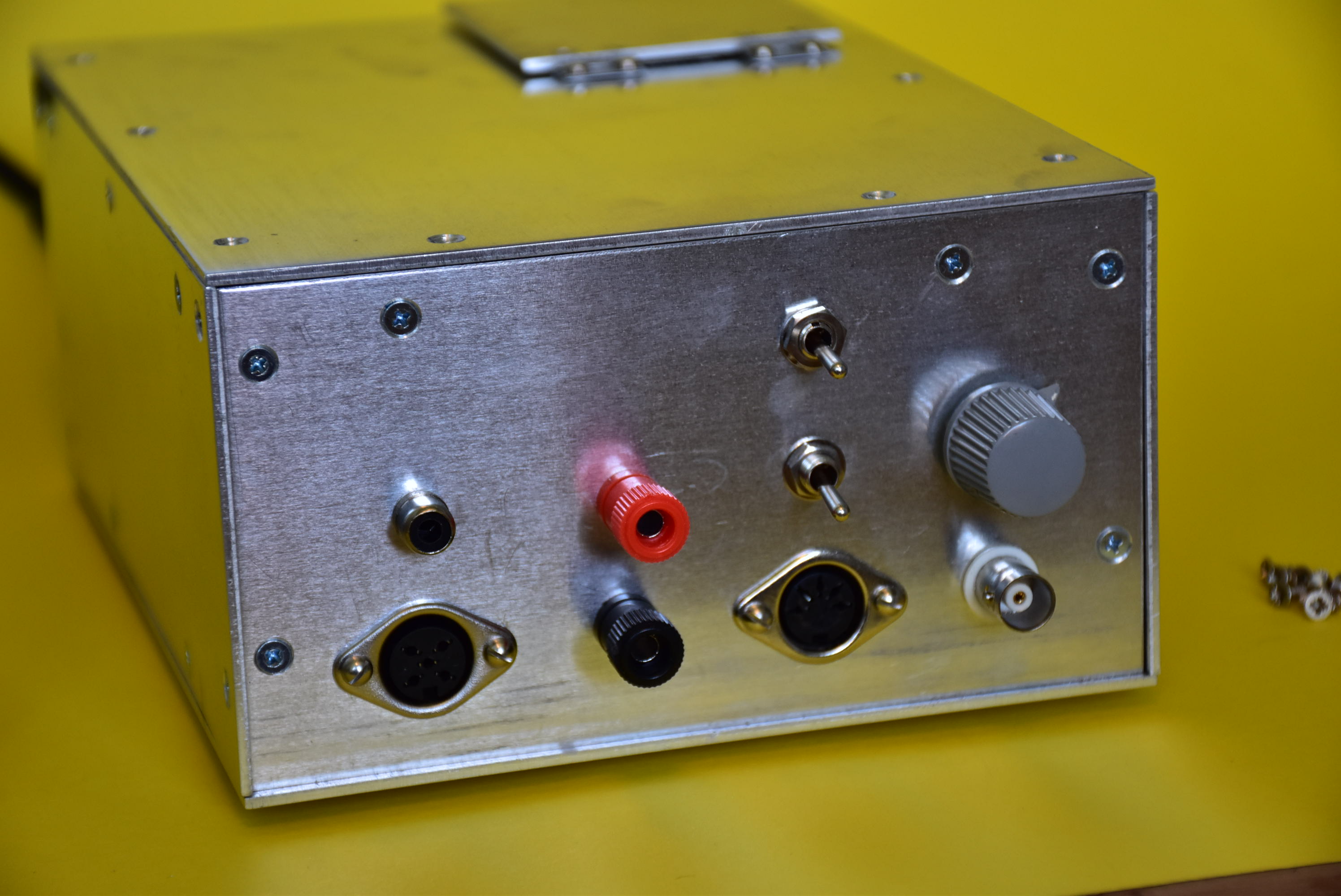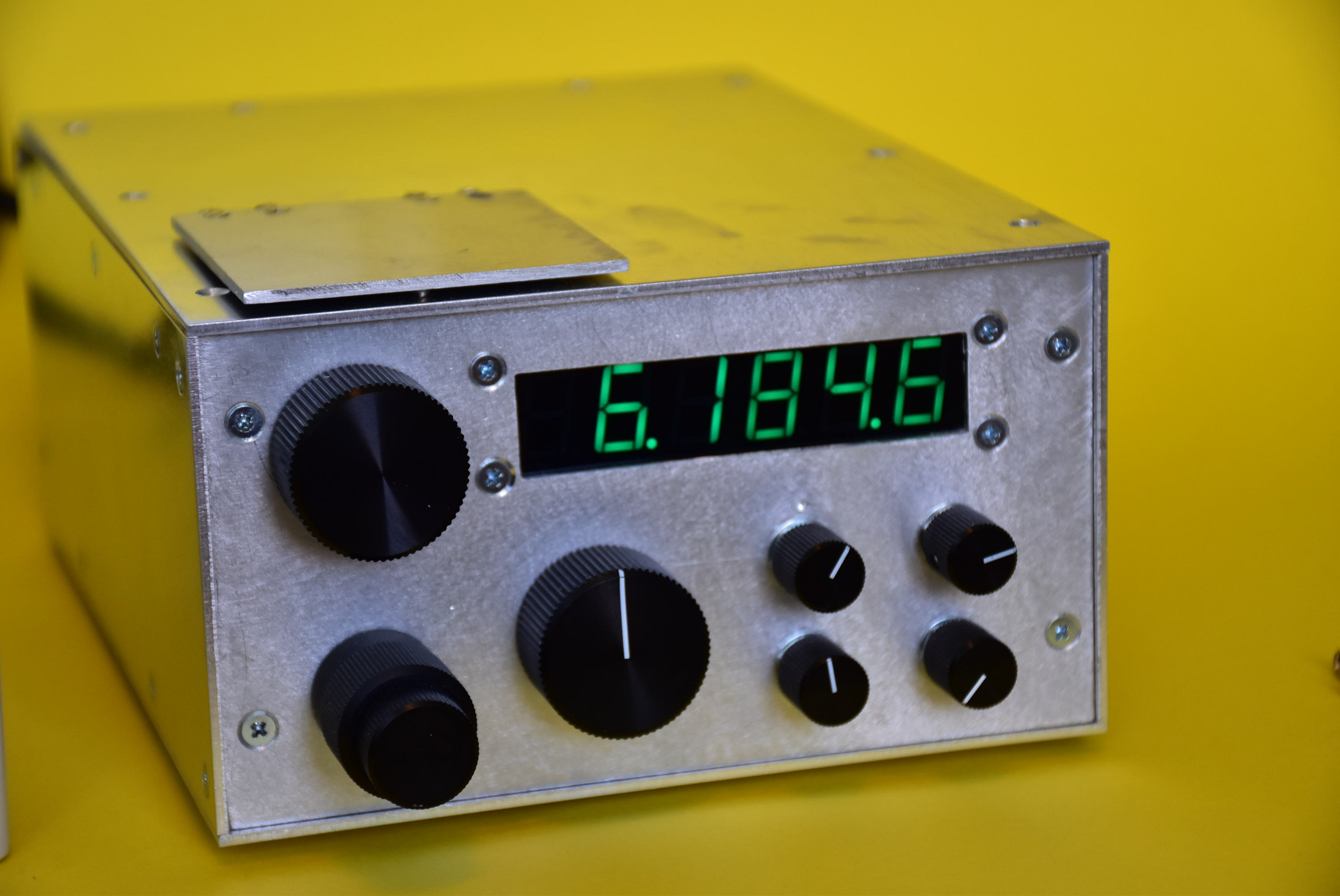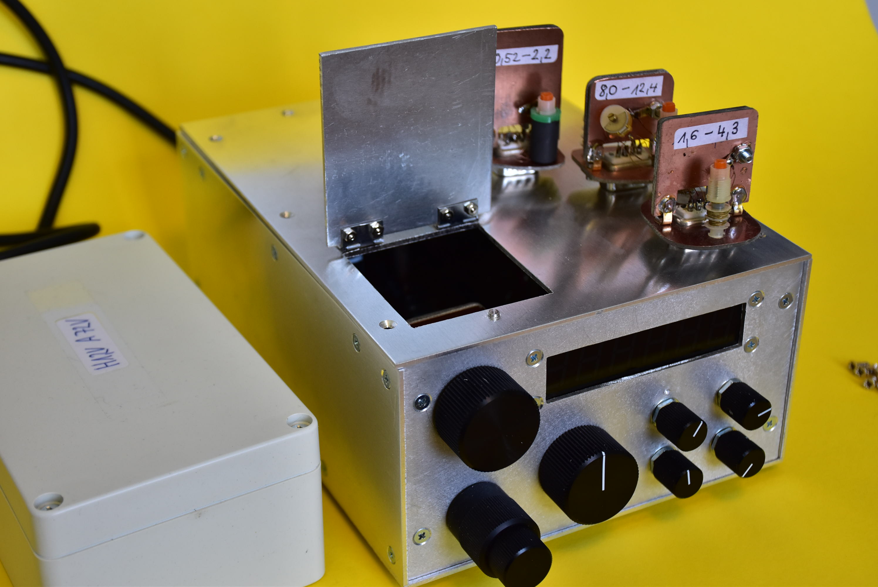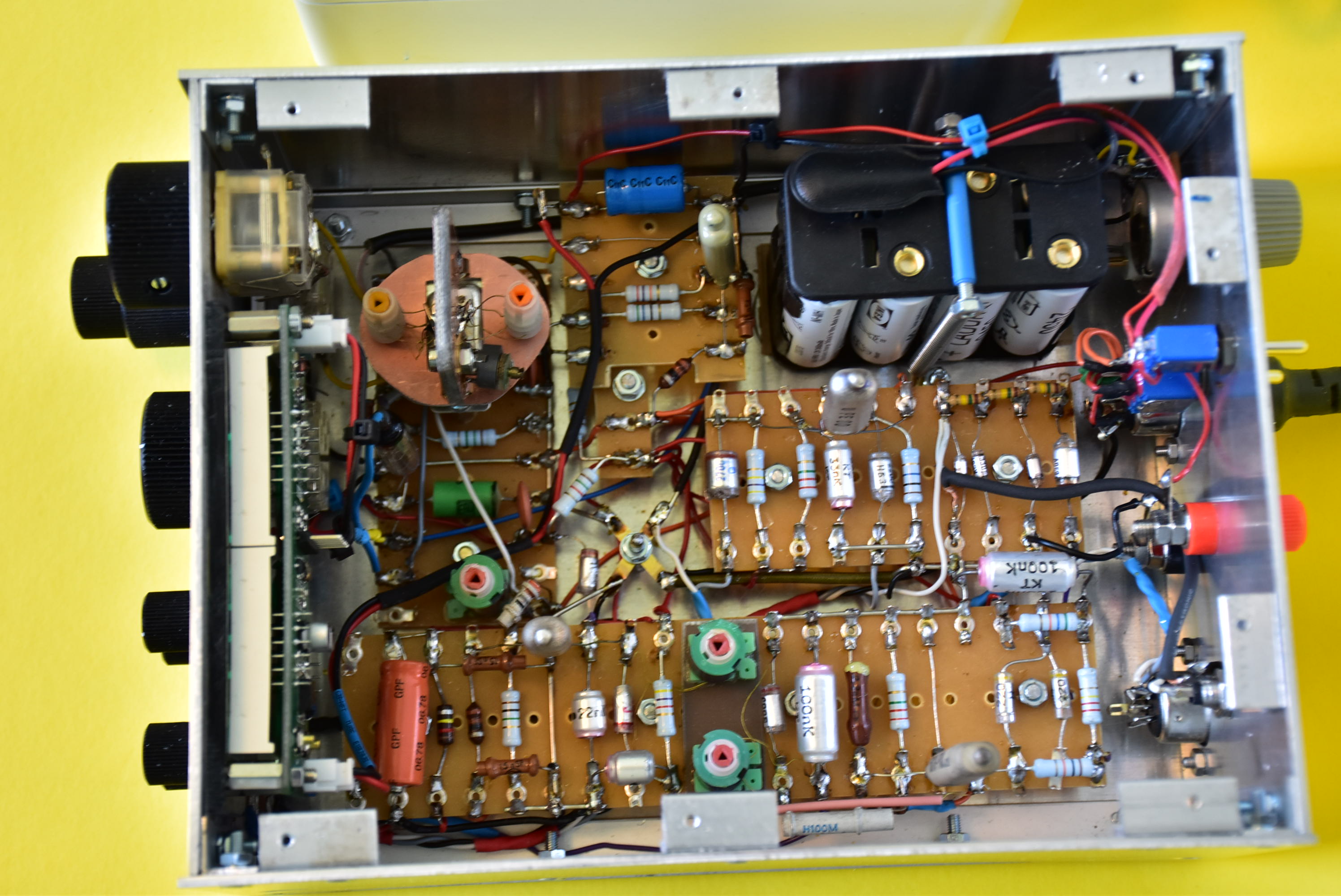 um die "gesellschaftsreduzierte" Zeit zu nutzen, habe ich mal wieder gebastelt. Entstanden ist ein aufgemotzter Kleinsuper mit Batterieröhren. Normalerweise ist dieser Empfängertyp einfachst mit Mischstufe, Audion und NF-Stufe ausgestattet. Dieser aber verfügt über einen entdämpfbaren Eingangskreis, einem separaten Oszillator und einer ZF-Stufe vor dem als Audion geschalteten Demodulator. AM, CW, LSB und USB sind somit möglich. Insgesamt sind 5 Pentoden im Spiel, davon eine russische mit herausgeführtem Bremsgitter als Mischröhre. Die Gesamtverstärkung ist deshalb sehr hoch. Da eine automatische Verstärkungsregelung nicht existiert, muss alles von Hand eingeregelt werden, was allerdings auch Spaß macht und dem Gerät eine gewisse Flexibilität verleit. Es gibt Regler für Vorkreisentdämpfung, ZF-Verstärkung, Rückkopplung Audion, NF-Lautstärke und Feinabstimmung. Der niederohmige Antenneneingang kann über ein einfaches Poti abgeschwächt werden. Auswahl der Empfangsbereiche geschieht über Steckmodule auf denen die Kreise für Oszillator und HF angeordnet sind. Über einen kleinen Deckel auf der Oberseite werden die Module ausgetauscht. Die Stromversorgung geschieht über ein mehradriges Kabel von einer mit Batterien bzw. Akkus bestückten Box. Über 100 Stunden Betrieb sind möglich. Im Empfängergehäuse ist der Akku für das abschaltbare Frequenzzählermodul untergebracht. Es gibt einen NF-Ausgang über Cinch und einen hochohmigen Kopfhörerausgang.
