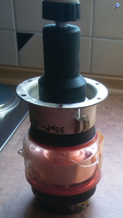 Als Material diente Blitzableiter-Draht (ca. 6mm Durchmesser), der zusammengesetzt werden musste, da ich nicht mehr genügend Draht am Stück hatte. Für einen Schönheitspreis dürfte es daher nicht ganz reichen Der Abstimmkondensator ist ein russischer Vakuum-Drehko mit einer Maximalkapazität von 1.2nF und über 4kV Spannungsfestigkeit. Da er keine Schleifkontakte hat, sind die Verlustwiderstände sehr gering. Als Antrieb dient ein Schrittmotor mit Getriebe, dank der Vorspannung durch das Vakuum gibt es keine Probleme mit mechanischem Spiel.