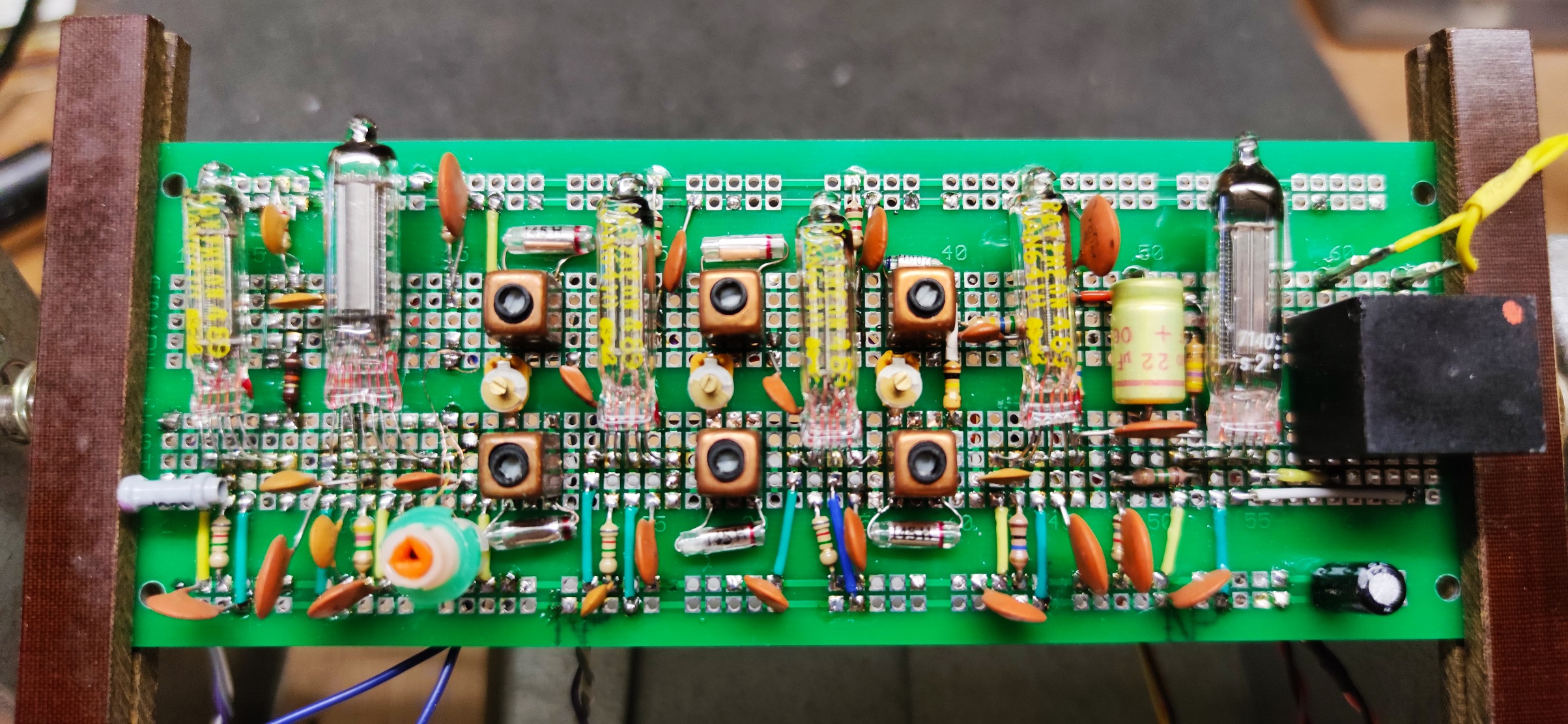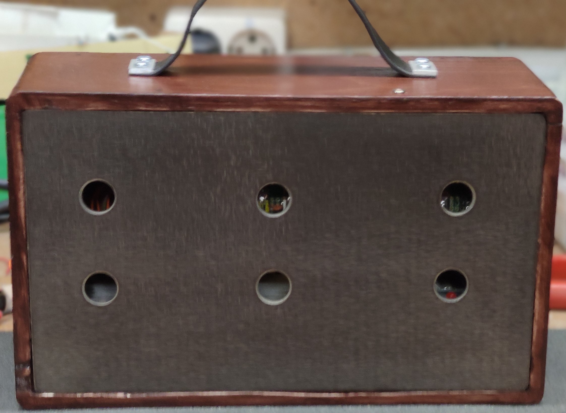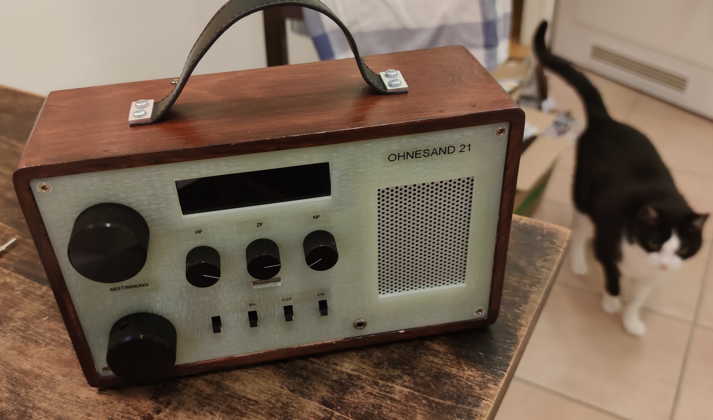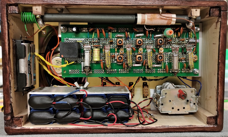 inspiriert durch HB9´s großartigem Batterieröhrenprojekt entstand diese Batterieröhren-Kofferradio im Retrostil, wenn man mal von der Frequenzanzeige absieht… Eine Analogskale zusammen zu frickeln hatte ich keine Lust. Da bieten sich die 10 € Teile vom Chinamann bestens an. Das Magische Auge (in diesem Fall ein Magischer Strich) wird durch eine DM160 realisiert und funktioniert tadellos. Empfangsbereich 520 bis 1750kHz. In der HF-Vorstufe mit Rückkopplung werkelt eine 6418. Die gleiche Röhre wird in den beiden ZF-Stufen und der NF-Vorstufe eingesetzt. Der Mischer arbeitet mit einer 2G21. Eine Triode-Hexode in dem winzigen Glaskolben, fantastisch! Und das funktioniert mit 25 Volt Anodenspannung. Die Lautsprecherstufe arbeitet mit einer 5672. Diese kann immerhin 65mW abliefern und man wundert sich, was damit möglich ist… Allerdings ist der Abgleich eines ZF-Teiles mit 6 Kreisen ohne Wobbelmessplatz ein Geduldspiel und eine echte Herausforderung. Die Bandfilter des sehr schwingfreudigen ZF-Verstärkers mussten zunächst mit Widerständen bedämpft werden. Immerhin beträgt die 6dB-Bandbreite jetzt +/- 1,8kHz und ist einigermaßen symmetrisch, gut für DX. Ich habe keine automatische Regelung vorgesehen. So ist es möglich, alles an Empfindlichkeit herauszuholen. Ich mag es, an vielen Knöpfen zu drehen. Rückkopplung in der Vorstufe, ZF-Verstärkung und NF-Lautstärke, alles von Hand einstellbar. Die Regelspannungsgewinnung dient nur der Ansteuerung für die DM160 als Abstimmhilfe. Es werden bis über -4Volt erreicht, die locker ausreichen den Magischen Strich dunkel zu steuern. Beim Einstöpseln des Kopfhörers schaltet der LS ab. Das Radio konsumiert ca. 4mA Anodenstrom und läuft mit einem Batteriesatz mind. 50 Std. Der Heizakku bringt ebenfalls 50 Std. Frequenzdisplay und DM160 sind abschaltbar. Mir ist es nicht gelungen, die „Betriebsgeräusche“ des Displays zu eliminieren. Vielleicht hat da jemand einen Tipp? Weiter gibt es auf der Oberseite eine Buchse für eine kurze Stabantenne für die Seitenbestimmung bei der Peilung. Und der Empfang? Braucht sich nicht vor einem PL880 zu verstecken! Mit Kopfhörer absolut DX-tauglich. Wenn gewünscht, werde ich noch ein Schaltbild nachliefern.