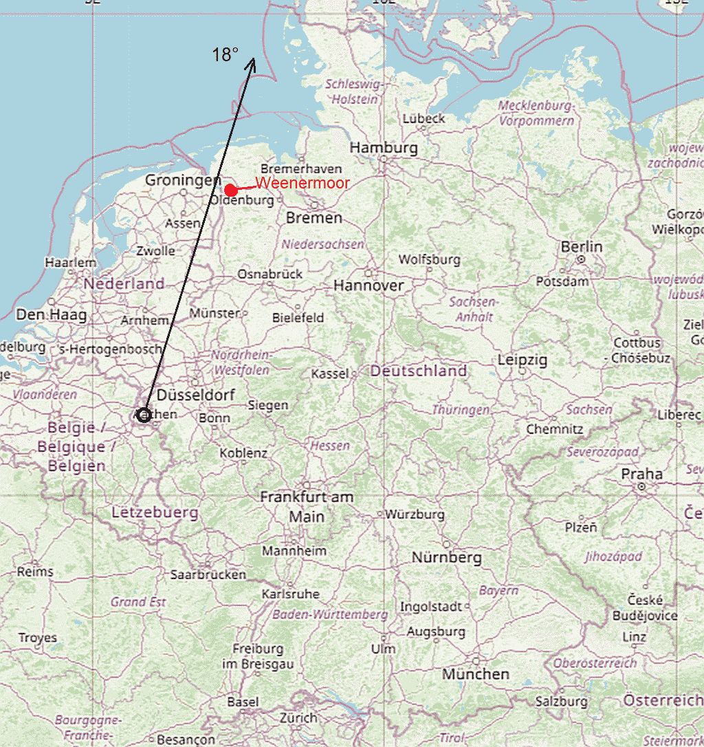 Um 09:15 Ortszeit den Sender Weenermoor auf 3995kHz angepeilt. Wider Erwarten konnte schon mit nur etwa 10 Peilungen ein deutliches Minimum sichtbar gemacht werden. Der Kompass zeigte die Richtung 18°, meine Einteilung auf dem Bildschirm NNO, was 22,5° entspricht. Der Unterschied kommt durch die nicht ganz genaue Eichung der X-Achse.... Kann man doch nicht meckern?
