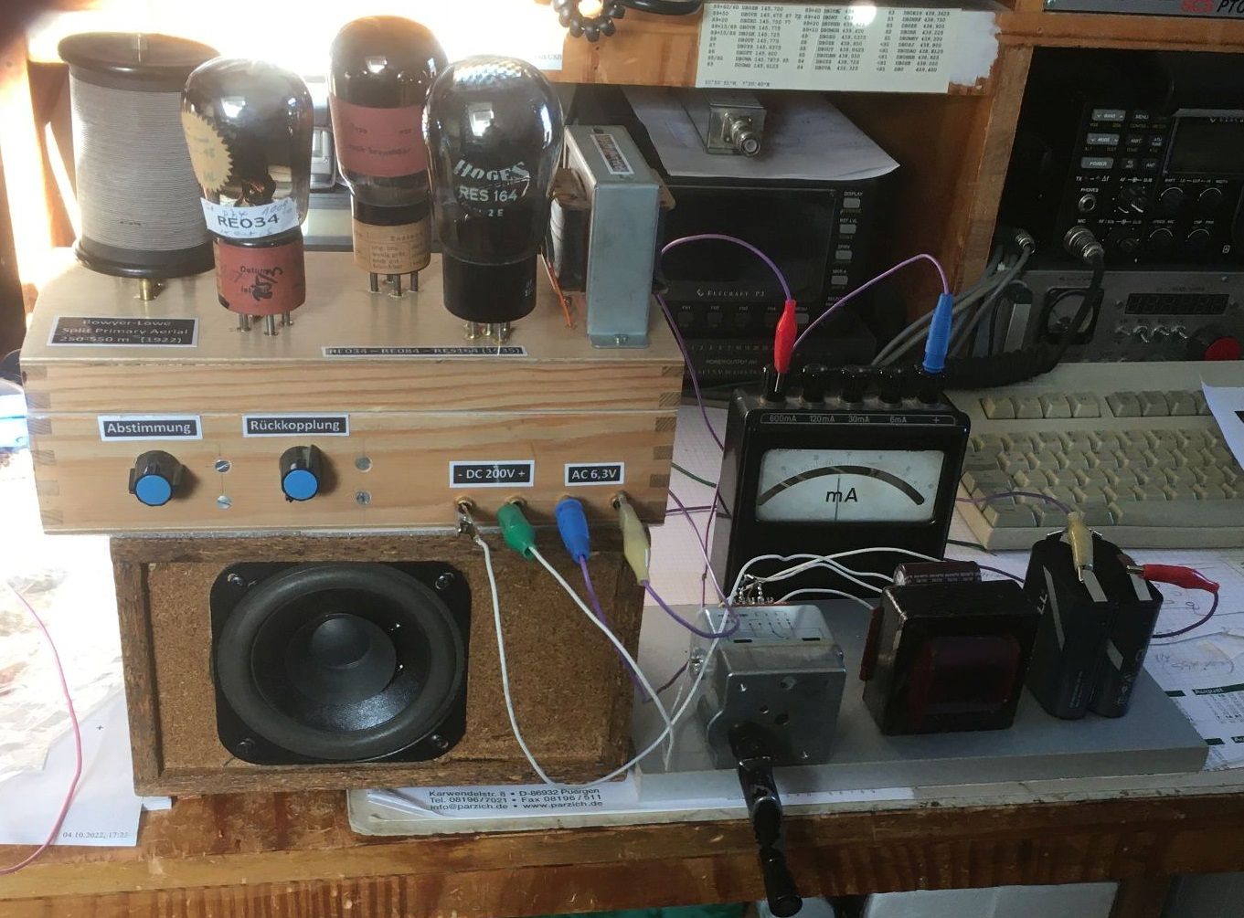 Hier sollte die Heizung entweder über eine 6,3 V Wechselspannung oder 9 V DC betreibbar sein. Für die Anodenspannung immer das Labornetzteil aus dem Keller zu holen ist mühsam. Stattdessen arbeitet jetzt der Induktor auf eine Graetz-Brücke mit 4x 1N4007. Dahinter kommen zwei 100 MFD Elkos und dazwischen eine Drossel. Die Sache funktioniert prima, man kann langsam drehen und auch einmal eine Pause von 5 Sekunden einlegen. Das Radio benötigt für Zimmerlautstärke etwa 15 mA zwischen 100 und 200 Volt Anodenspannung.