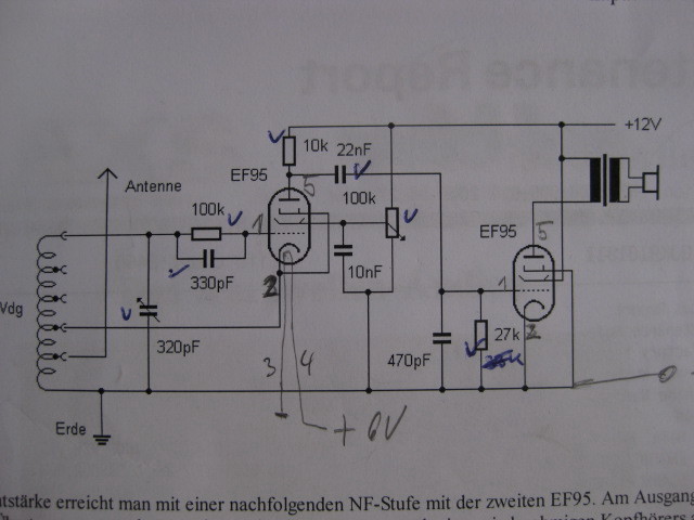 ja das hatte ich vergessen in meinem Text mit zu erwähnen. Habe hier gleich noch mal ein Foto der jetzigen Schaltung mit hinzugefügt. Der Kondensator war schon erforderlich zur Optimierung. Im Versuch ohne Kondensator brach der Empfang sofort ab. Als Antenne habe ich einen ca. 15m langen Draht an der Schlafzimmerdecke im Z Format gespannt (zur Freude meiner Frau) und als Erde dient der gute Heizkörper.