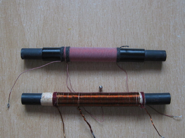Da die Empfangsleistung am Anfang nur gering war habe ich mit verschieden Spulen experimentiert und dabei merkliche Unterschiede gehabt. Die jetzt im Foto zu sehende Spule ist ein Nachbau des Bauvorschlags für einen Audion-Radio-Empfänger mit Rückkopplung aus diesem Forum. Der Cu Draht ist zwar zu dünn, habe aber mit dieser Spule erstmal den besten Empfang.