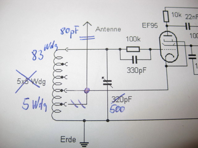 Es muß sicher sein, daß man das Gerät sicher aus den Schwingen (mit dem Einstellen der Schirmgitterspannung) heraus bekommt, aber auf der höchsten Frequenz noch sicher zum Schwingen gelangen kann. Das kann mal also durch paar Windungen mehr weniger genau einstellen.