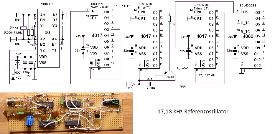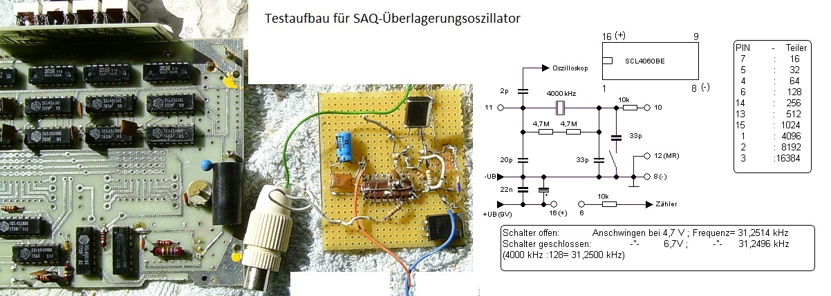 Es sind oft die Deteils, die beim Aufbau Zeit kosten, so stellte sich heraus, dass beim CD4060 der Widerstand auf 10 kOhm verringert werden musste, damit er im 4 MHz.Bereich zu schwingen anfing. ----