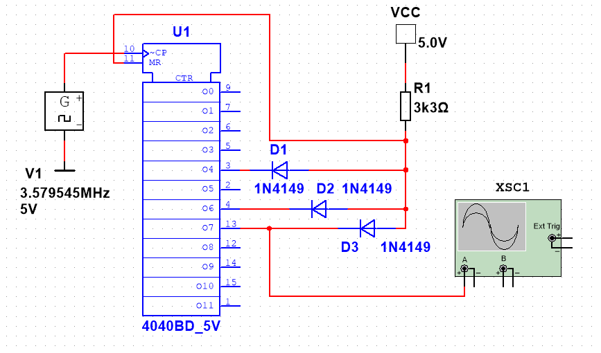 Da die Schaltung so lässig reingeschlenzt wurde, erlaube ich mir mal eine Tor-Analyse: Mit Einschalten der Betriebsspannung sind alle Ausgänge auf 0 Volt, der Zähler beginnt zu zählen, und zwar wenn der Takt von 5 V auf 0 V geht. Es gibt nur eine einzige Kombination der Ausgänge, bei welchen ein Master-Reset ausgelöst werden kann: Q4 (=16) + Q6 (=64) + Q7 (=128) sind alle auf 5 V und es wird über den Widerstand MR auf 5 Volt hochgezogen Da 16+64+128= 208 ergibt sich 3579,545 kHz / 128 = 17,209 kHz. Quarzgenau 9 Hz über der Zielfrequenz!. Das ist "nichts".