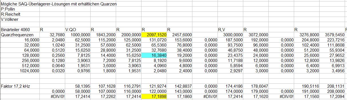 Nachtrag: Eine Tabellenkalkulation erleichtert die Suche nach möglichen Quarzen, im Verlauf des Threads zeigte sich die Möglichkeit auf, mit Teiler-Bausteinen wie dem 4040 und (eingeschränkt) 4060 viele Frequenzen zu erzeugen. (Anhang)