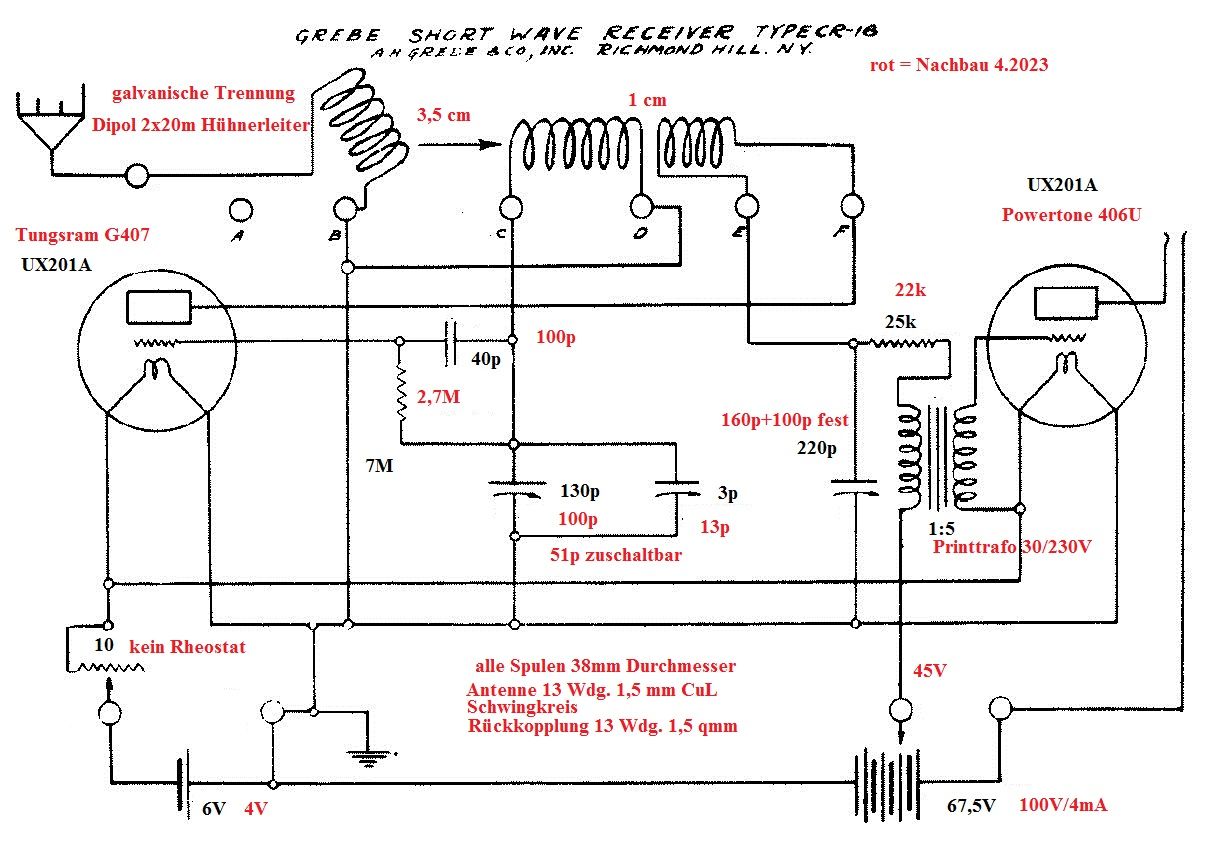 Zum Betrieb des CR-18 waren 4 Spulensätze notwendig, die immer getauscht werden mussten. Er enthielt zwei UX201A. Selbst 12 Jahre später wurde die Schaltung nahezu unverändert noch verwendet, wie ein Blick in die Monatszeitschrift "Popular Science" auf Seite 108 verriet. ("Span the world with this globe receiver by Frank Tobin") Hier kamen zwei Trioden des Typs 30 zum Einsatz. Die Anodenspannungen wurden allerdings halbiert und der 25 kOhm-Widerstand zum Übertrager durch eine Kreuzwickeldrossel in Mehrkammertechnik ersetzt. Da fällt mir ein, dass ein WGFler so etwas nachbauen wollte.