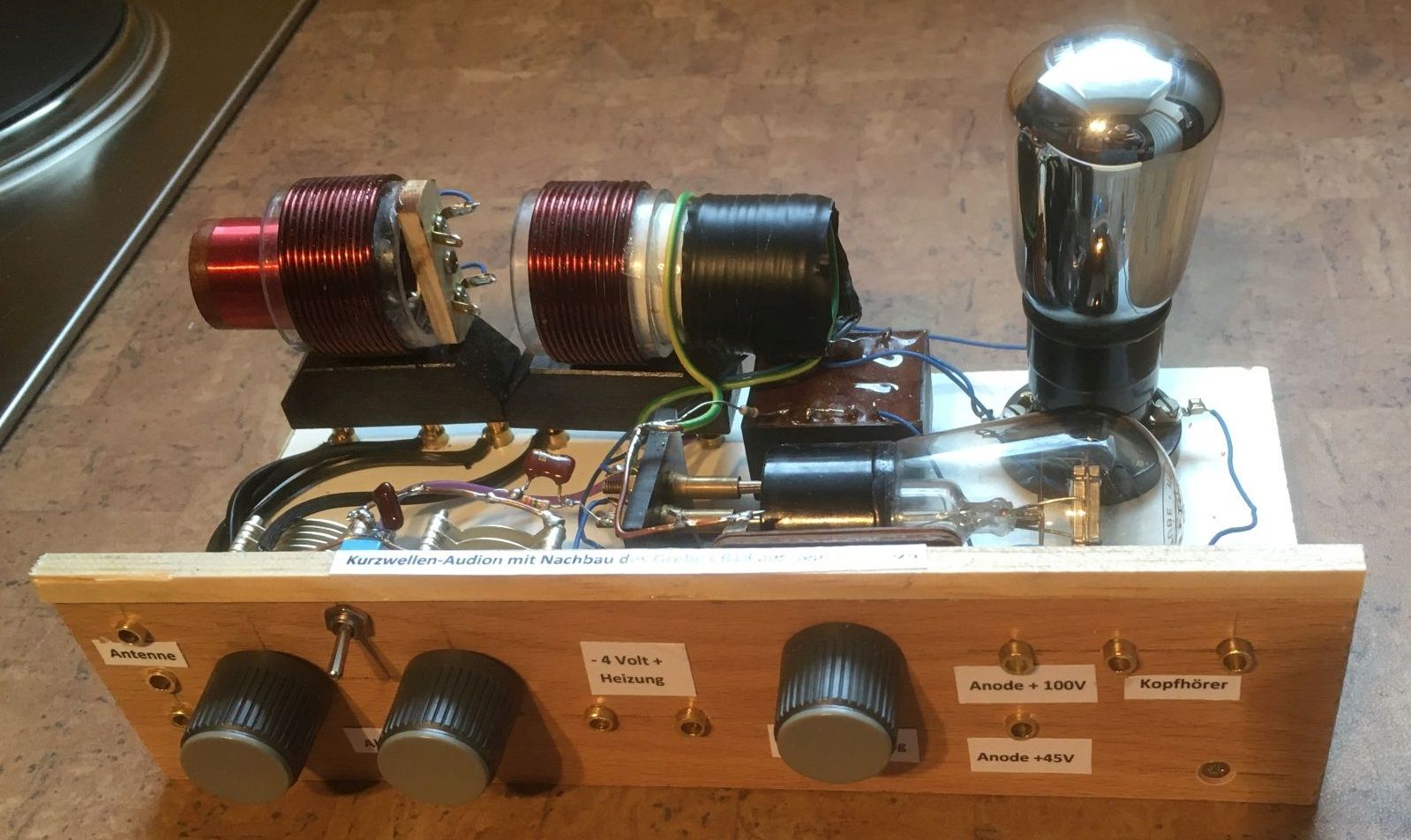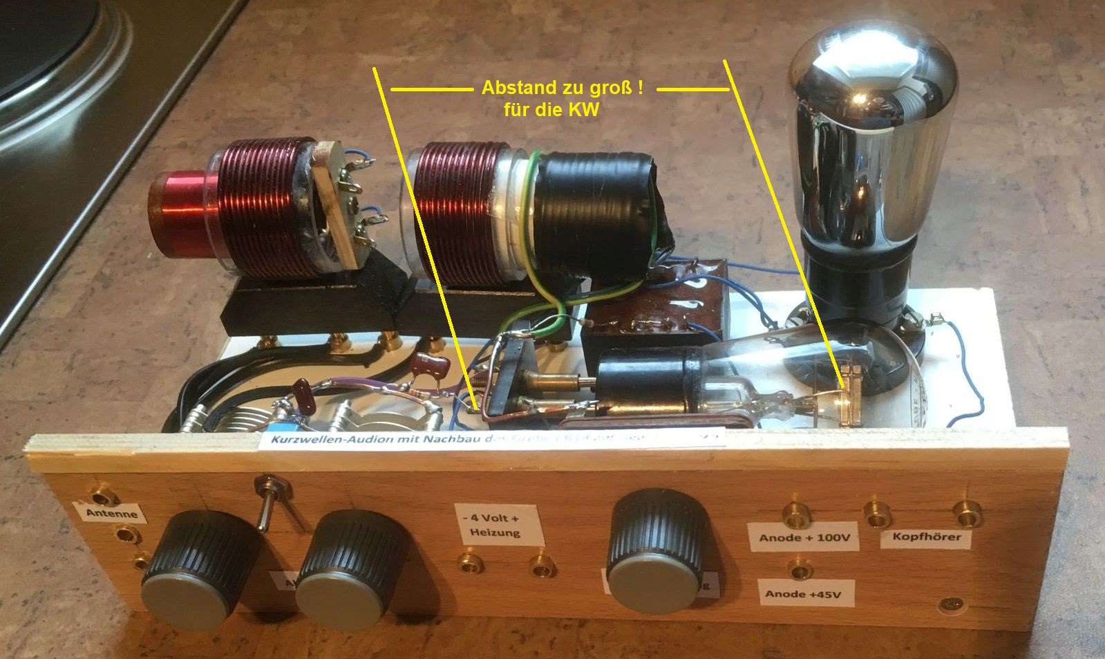 Die Schaltung ist freilich nicht alles. Die Funktion hängt wesentlich von der Aufbauweise ab. Kurze Leitungsführungen sind absolut notwendig. Völlige Schirmung war damals noch nicht üblich, wohl aber Frontbleche zur Vermeidung des Einflusses von Handkapazitäten. Im Gegensatz zu dem Hemme-Audion