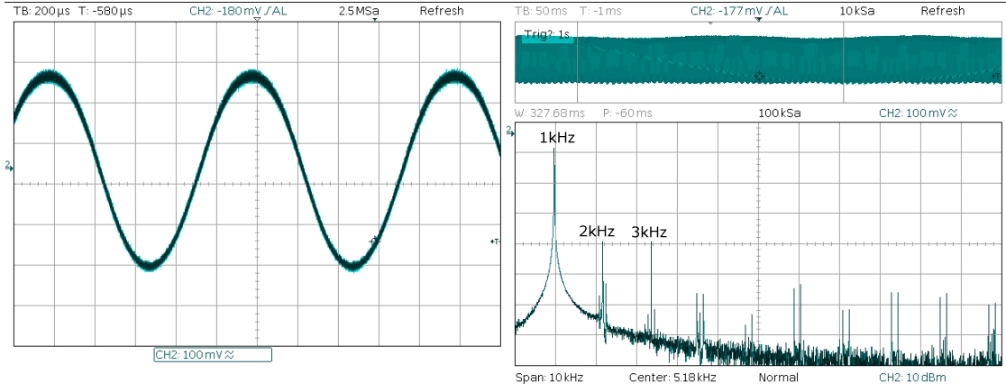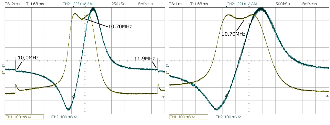 Die anschließenden Messungen dienten dem Nachweis der Demodulatorfunktion, eine quantitative Bewertung war (noch)nicht vorgesehen. Die Abbildung zeigt links Diskriminator- und Bandfilterkurve über den gesamten Wobbelbereich, rechts eine Ausschnittsvergrößerung. Die 10,7MHz-Marke(Unregelmäßigkeit in der Bandfilterkurve) ist leider kaum zu erkennen. Die Filterbandbreite beträgt etwa 300kHz. Dieses Bild zeigt das Demodulationsergebnis: Nf 1kHz Sinus, Hub 70kHz, f_0 10,7MHz, links der erhaltene Sinus, rechts sein Spektrum.