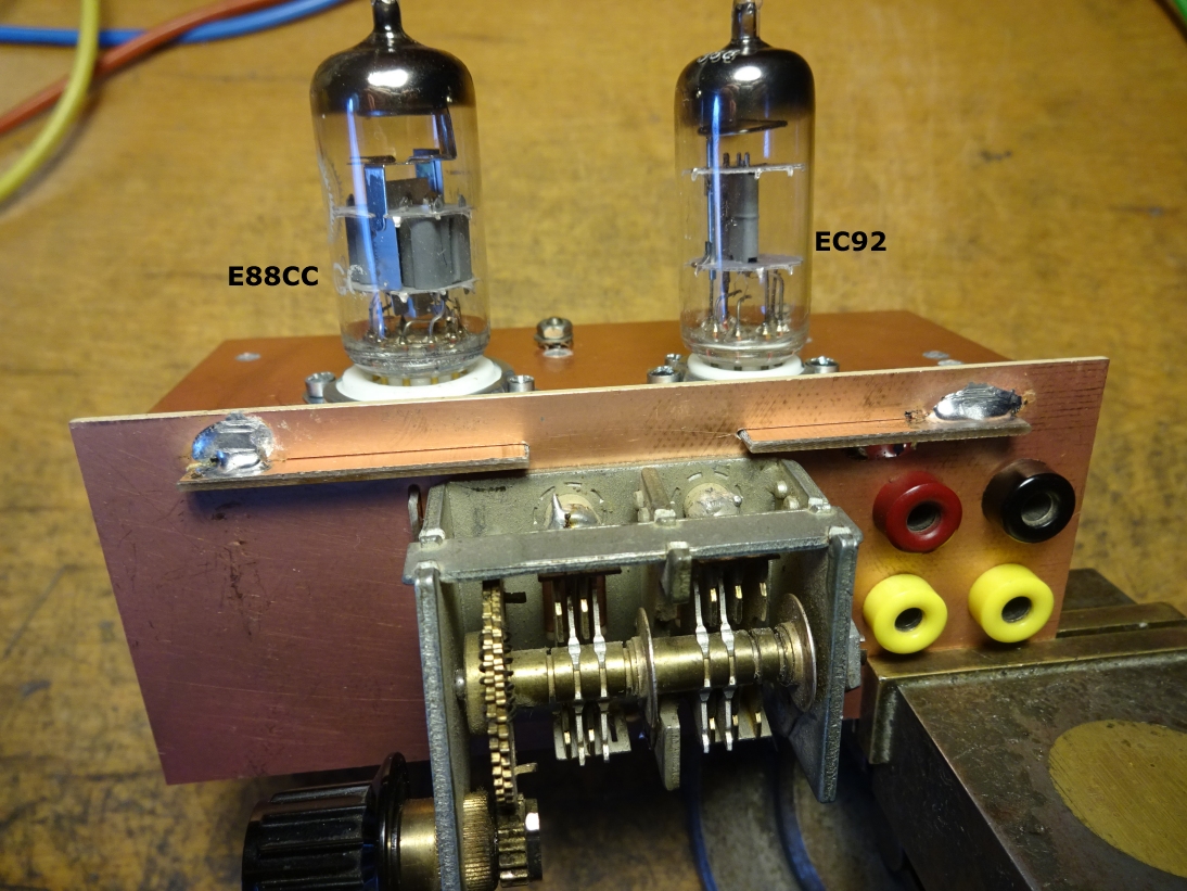 Eine E88CC und eine EC92 bilden die aktiven Komponenten des Mischteils. Die Doppeltriode übernimmt, in Kaskodeschaltung, die HF-Verstärkung. Für Gleichspannung sind beide Systme in Serie geschaltet, die Wechselspannungskopplung erfolgt über ein Pi-Glied. Der Einfachheit halber (und weil der Abstimmkondensator nur zwei Statorpackete hat) ist der Antennenanschluß breitbandig mit dem Kaskodeneingang verbunden, der Ausgang dagegen an den Hochpunkt des Zwischenkreises geführt. Die zweite Röhre arbeitet als selbstschwingender Mischer. Im Gegensatz zur üblichen Kathodenbasis-Beschaltung des Oszillators schwingt dieser Oszillator in Gitterbasisschaltung als induktiver Dreipunkt - um die ZF(10,7MHz) versetzt oberhalb der Empfangsfrequenz. Die HF wird dem Gitter der Röhre zugeführt, an dem (theoretisch)nur minimale Oszillatorspannung ansteht und es daher zu geringster Abstrahlung der Oszillatorfrequenz kommt. Da HF-Spannung und Oszillatorspannung an verschiedenen Röhrenanschlüssen liegen, ist diese Schaltung wohl als multiplikativer Mischer anzusprechen.