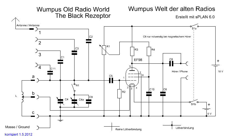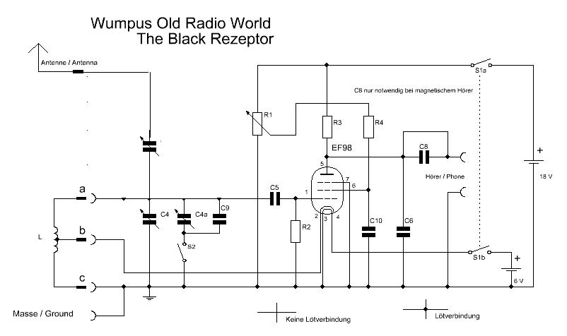 seit 2005 gibt es ja auf meiner "Wumpus Welt der alten Radios" - WEB-Site einen Bauvorschlag für ein Röhren-Audion-Empfänger, der mit einer Niederspannungsröhre EF98 auskommt. Als Anodenspannung reichen 18 Volt, als Heizspannung 6 Volt aus.