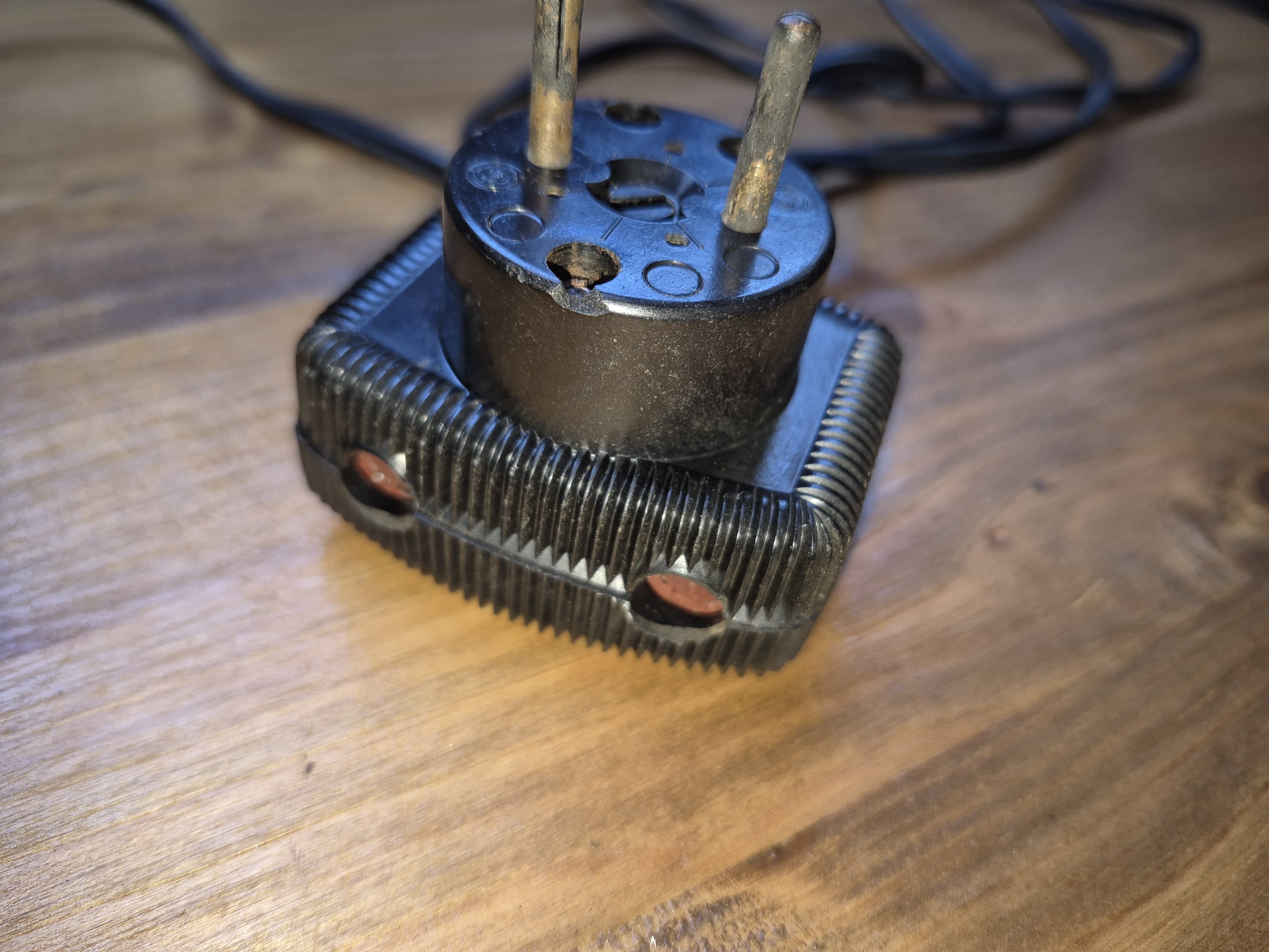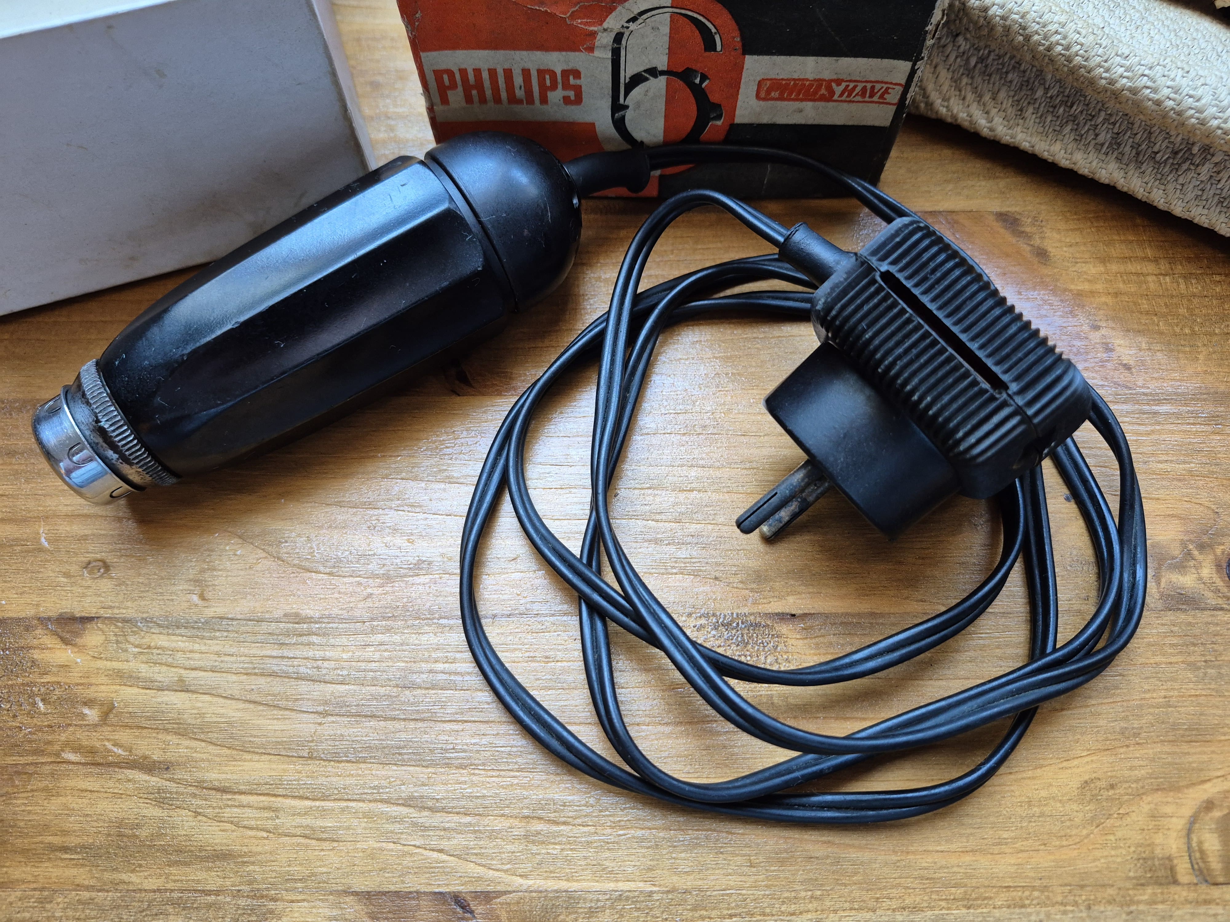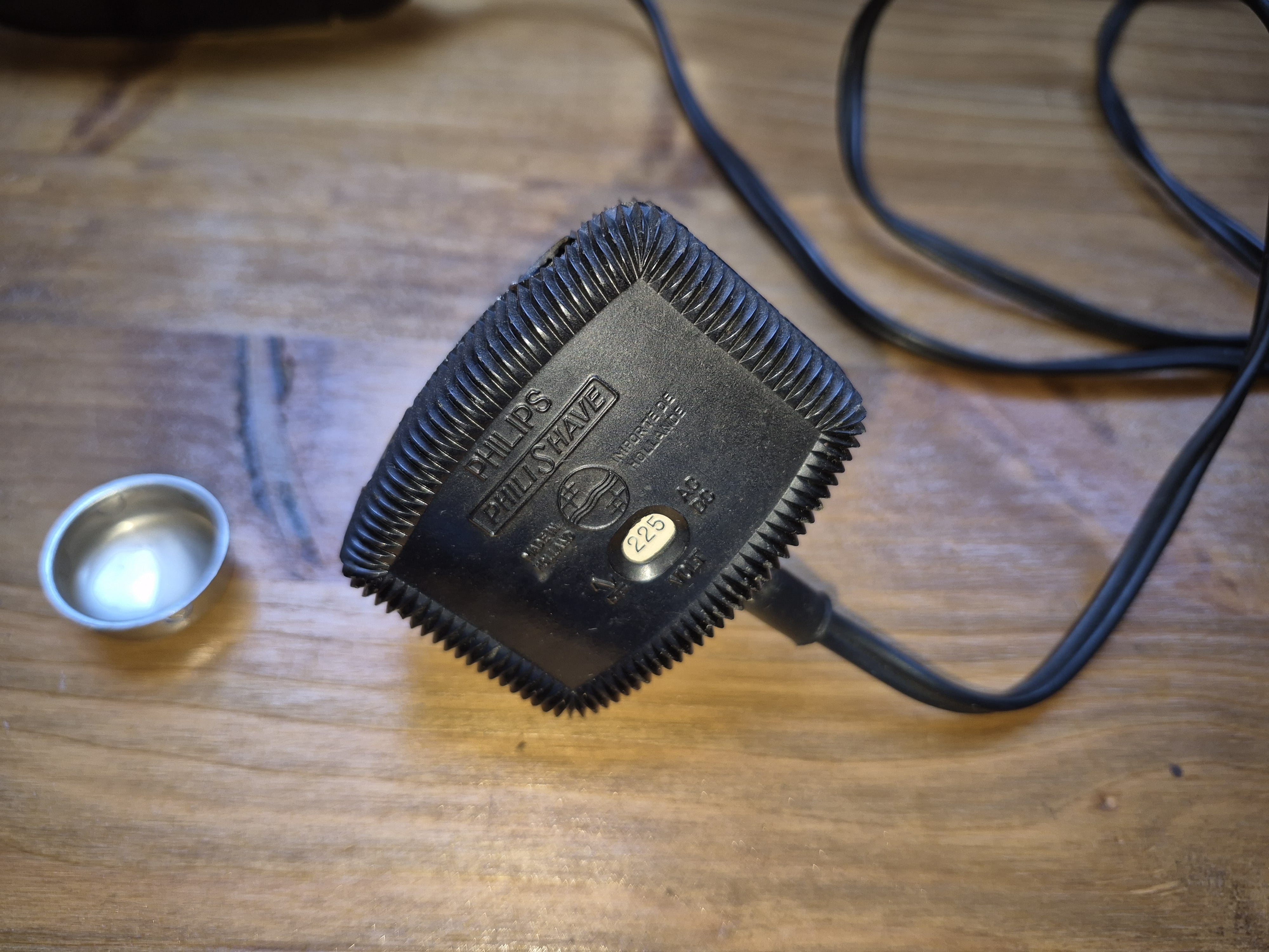 könnte vielleicht der Philishave 7733 von 1946 sein. Ich wäre da vorsichtig, das Gerät wieder in Betrieb zu nehmen! Allstrom, galvanisch am Netz, kein Schuko. Aussen ein Metallteil, das klingt aus heutiger Sicherheitssicht garnicht gut.