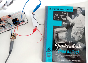 Im Buch heißt es auch: "Die Schaltung sei zu Studienzwecken zum Nachbau empfohlen". Natürlich ist es zwecklos, ohne starken Ortssender hier etwas zu empfangen, was dann NF-seitig zweistufig verstärkt werden kann. Deshalb kam mein kleiner Mittelwellenmodulator zum Einsatz, den ich im Forum schon vorgestellt habe. Anstelle des Kopfhörers mit 300 Ohm Impedanz habe ich einen Ausgangsübertrager zu einem niederohmigen Kopfhörer genutzt. Ein kleines Video zu den Ergebnissen ist in Vorbereitung. Es gibt dann noch eine Überraschung: Anschluss eines Lautsprechers.