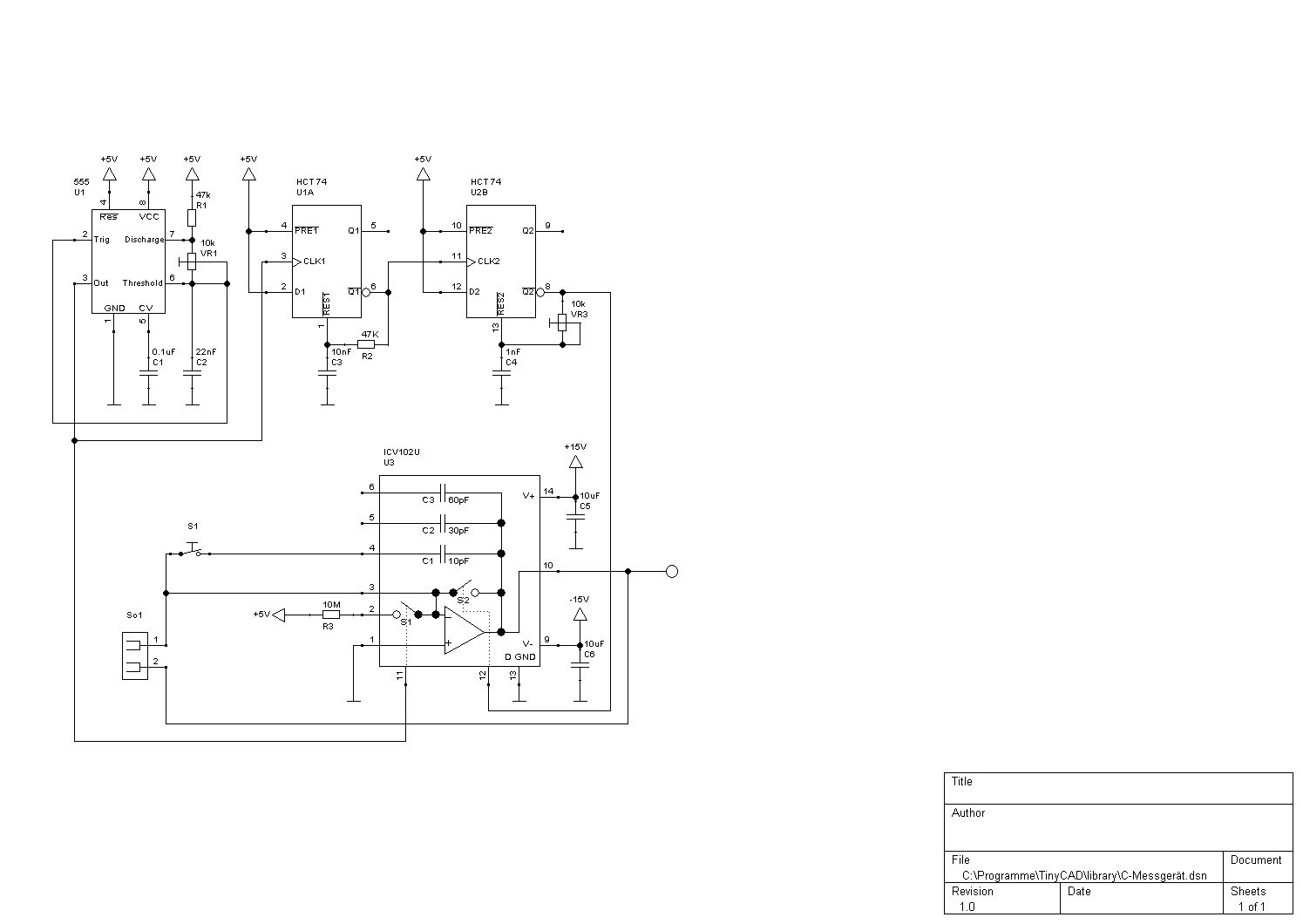 Übrigens, zum ausmessen der Kapazität der Drehhkos habe ich mir eine kleine Schaltung gebaut, mit der man auch Kapazitäten <1pF messen kann. Eigentlich handelt es sich hier um einen Integrator (siehe Anhang), aber durch den sehr geringen Offsetstrom im Eingang (ca 750fA) sind solche Messungen möglich.