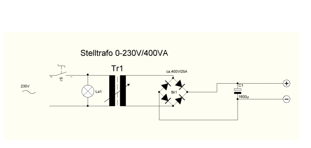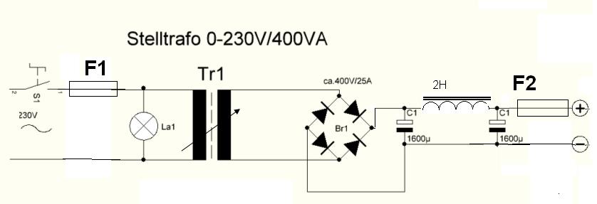 Guten Tag Für meine Röhrenexperimente habe ich mir ein einfaches Netzgerät gebaut.(s. Zeichnung) Ich glaube das Gerät ist aber zu einfach und liefert nicht Gleichspannungen in der nötigen Qualität um damit erfolgreich mit Röhren arbeiten zu können. Für Ideen einer besseren Ausführung wäre ich dankbar.