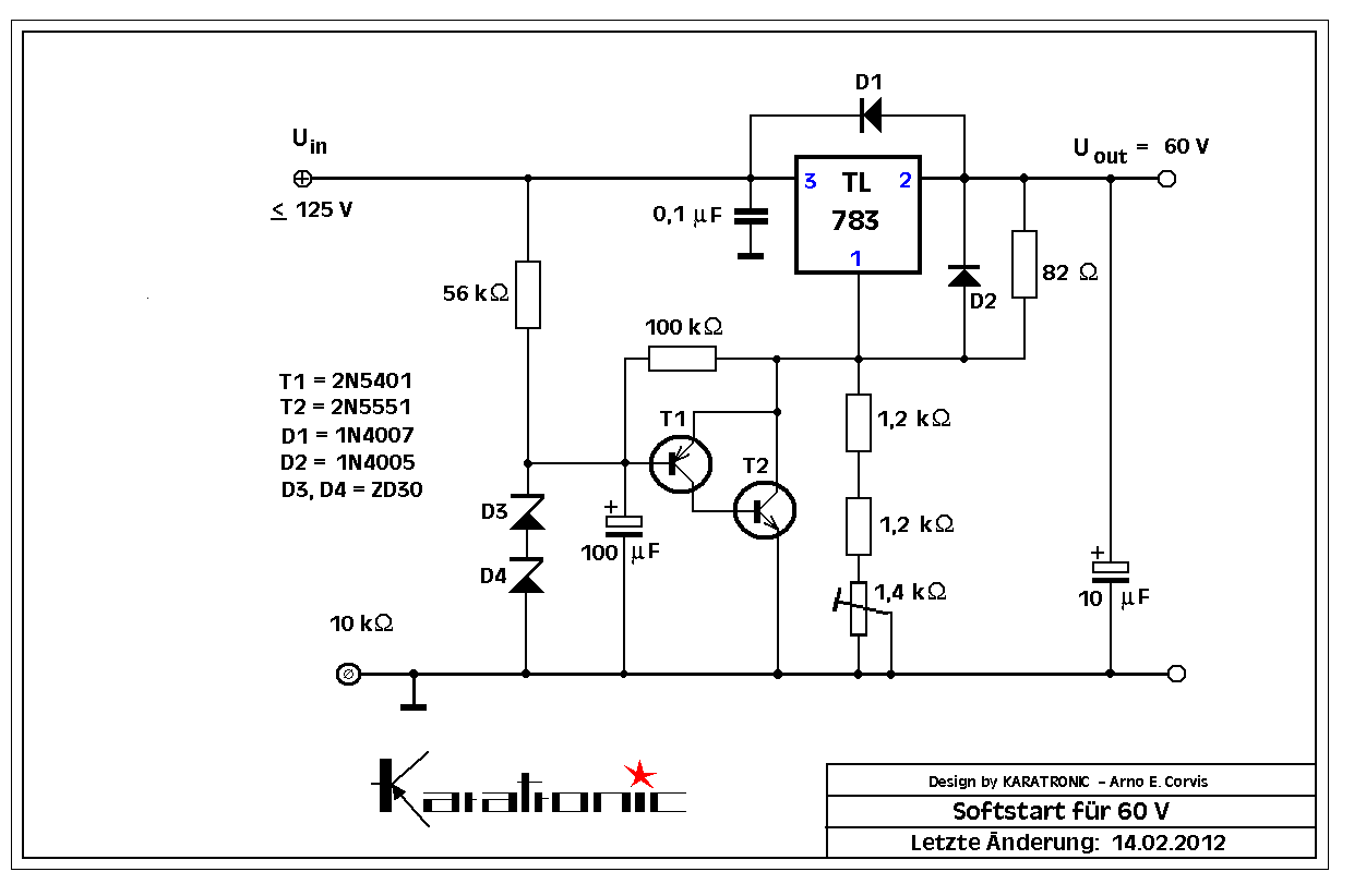Um die Spannung röhrenschonend auf 60 V langsam (binnen ca. 12 Sekunden) hochzufahren, habe ich die Schaltung um 2 Transistoren und eine Zenerdioden-Kombination erweitert, die man aber auch weglassen kann.