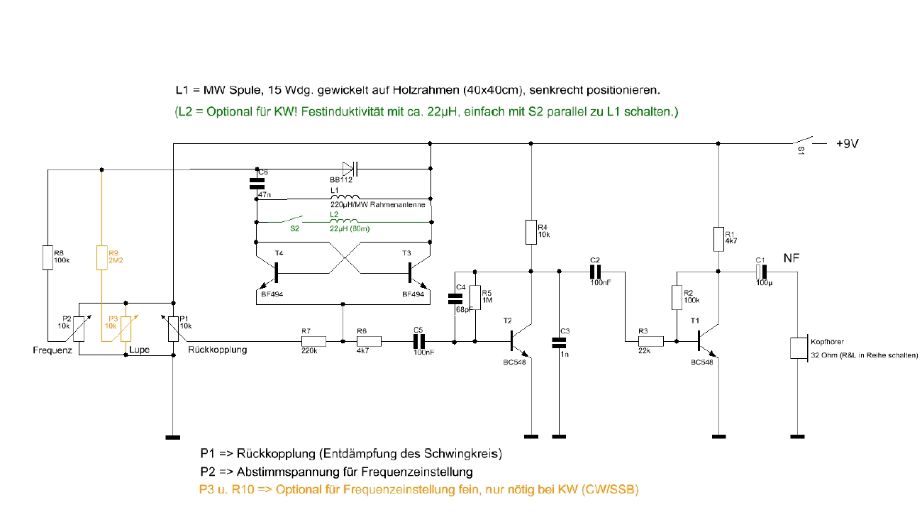 Hallo Mikesch, Du kannst an Stelle der Kapazitätsdiode einen Drehko einbauen. Dabei sollte die Rotorseite zu + der Versorgungsspannung liegen und die Versorgungsspannung mit einem 4,7 nF (HF-fähigen Kondensator) geblockt werden. Die Potis Frequenz und Lupe abtrennen. Feinabstimmung würde dann so nicht funktionieren. Man kann aber auch hier einen kleinen Drehko parallel legen zur Feinabstimmung. Der müßte genauso (Rotor) geschaltet werden, wie der Hauptdrehko.