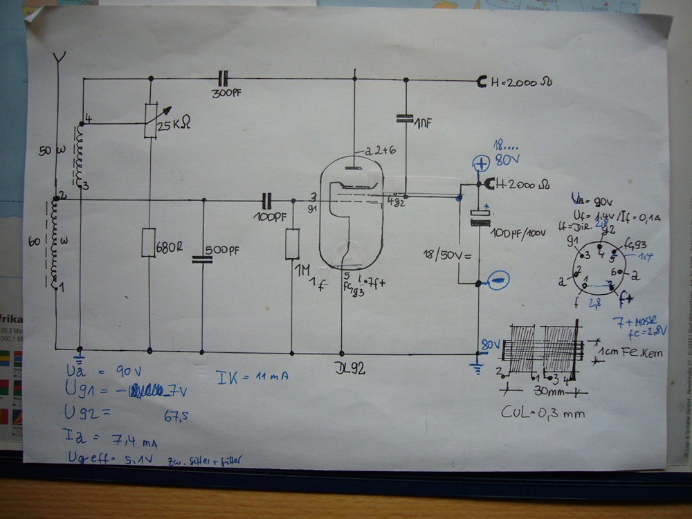 schön Dein kleiner Einkreiser aus Teilen aus der Bastelkiste. Mir ist aufgefallen, dass Dein Audion keinen eigenen Anodenwiderstand hat und der 2000Ohm Hörer diesen Part übernimmt. Vielleicht wäre es noch besser das NF- Signal hinter einem Anodenwiderstand abzugreifen und über einen 470nF Kondensator auszukoppeln. Das hätte den Vorteil, dass auch andere, niederohmigere Hörer, verwendet werden können. Ich habe an dieser Stelle meinen guten Sennheiser- Kopfhörer, mit 2x 100Ohm Gleichstromwiderstand am Start. Das klingt sehr gut.
