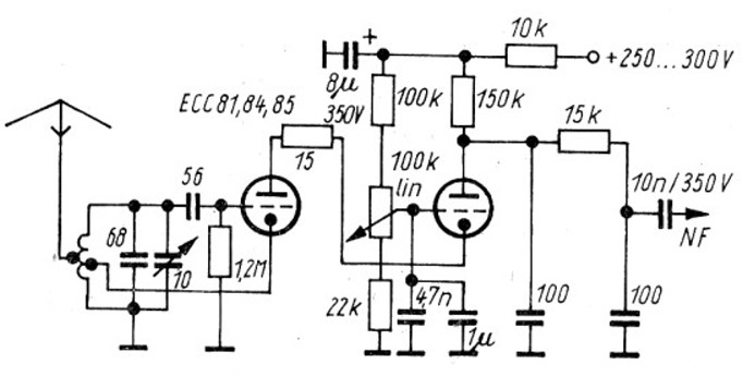 Ich schlage Dir einfach mal vor, einen Einkreiser (der dann auch noch wirklich auf 10 Meter spielen wird) mit Kaskode aufzubauen . Da könntest Du dann später noch eine HF-Vorstufe vorsetzen, eine NF-Stufe nachsetzen. Die Kaskode ist eine Gleichstrommässige Inreiheschaltung von zwei Trioden. Die Anode der unteren Triode ist mit der Katode der oberen Triode verbunden. Am Steugitter der oberen Röhre wird ca die halbe Betriebspannung zur "Regelung" des Gesamtsystem genutzt. Das Resultat ist eine butterweiche Rückkopplung mit wirklich guten SSB-Qualitäten. Bei sorgfältigen Aufbau ist das 10 Meterband noch lebendig, da streiken die meisten Penthoden-Schaltungen schon früh.