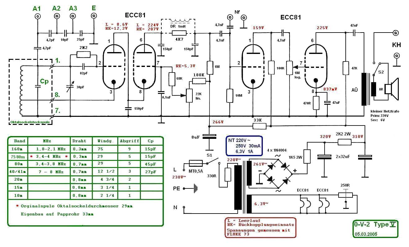 Vielen Dank für Deine Antwort und die sehr interessanten Hinweise. Zu Weihnachten habe ich einen "Radiomann mit Röhre" bekommen. Das "Kind im Manne" ist ausgebrochen... hi,hi.... Nicht nur das Aussehen hat mich total begeistert, auch die Empangsleistung mit nur 1er Röhre (ECC82/12AU7) (mit 12 V betrieben!!!) und mit einer mal eben selbst gewickelten Spule für 80m habe ich nachmittags um 17 Uhr G, ON und natürlich DL in CW gehört. Das hat jetzt meine Begeisterung für Röhren vollends geweckt. Da ich nun also schon einen 0V1 habe dachte ich mir, dass es nun etwas komplizierter werden darf und bin so auf den 1V2 gestossen. Was wäre Deiner Meinung nach der nächste Schritt nach dem 0V1?