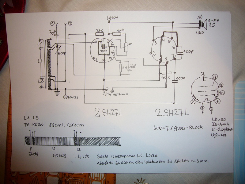 Vielen Dank an für die Antworten und vor allem den sofortiger Erfolg dadurch. Den Aufbau hatte ich schon vorbereitet. Jetzt ging es an das Verdrahten. Als erstes habe ich gleich die Heizung Parallel geschaltet. Die Masseverbindung mit minus Heizung (2 x 1,5 Volt) der Batterie, sowie Minus-Leitung der Anodenspannung verdrahtet. Als Spule habe ich einen Ferrit Kern verwendet mit 13 cm Länge, 1 cm Durchmesser. Darauf sind Antenne 3 Windungen, dann 40 Windungen und 4 Windungen Antenne 2 , gegen Masse (Erde). Seide umsponnene Litze war noch vorhanden.