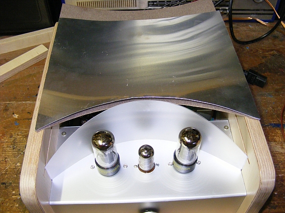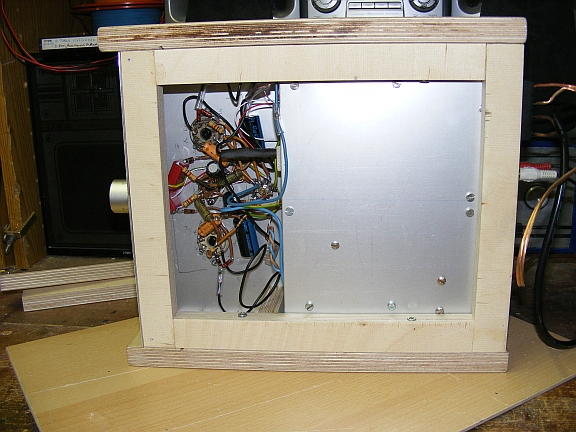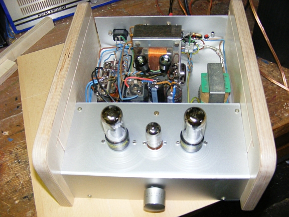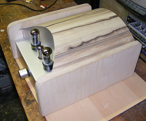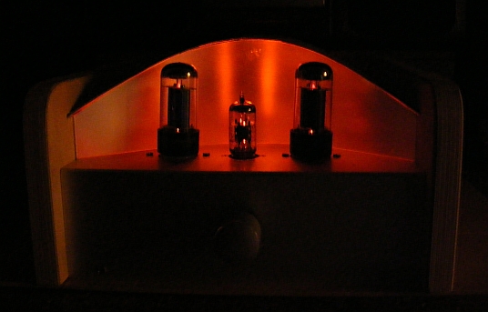 In meinem stillen Kämmerchen habe ich in den letzten Tagen mir einen Wunsch erfüllen können. Aus vorhandenen Röhren, 2 x 6V6, ECC81, AÜ´s für EL84 (passen auch zur 6V6) u.s.w. habe ich nach einem leicht abgewandelten Plan aus dem Internet einen Verstärker gebaut. Zuerst eine Seite erstellt, getestet und für gut befunden, machte ich mich daran die andere Hälfte zu bauen. Als als das Ganze nach Beurteilung von einigen mit musikalischem Gehör ausgerüsteten Bekannten mir eine gute, zufriedenstellende Arbeit bescheinigten, machte ich mich daran der Arbeit eine endgültige Form zu geben. Holz für die Hülle und Alubleche für das Chassis, sowie fresnellartige Folien von einem auseinanderbebauten, defekten Flachbildschirm sind weitere Baumaterialien. Die Innenbeleuchtung dient als Kontrolllampe für den Betrieb, auch zu einem raschen Entladen der Kondensatoren nach dem Auschalten der Anlage, und als Stimmungsmittel, was gewiss Geschmacksache ist, aber mir gefällts.