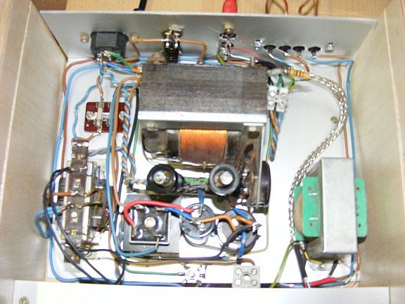 Vielen Dank für Euere ehrlichen Meinungen. Nun möchte ich noch einige Bilder vorstellen, sowie die Schaltungen. Nach meinem Kenntnis und momentanem Wissenstand habe ich die Schaltung angefertigt. Lieber einen dickeren Draht verwendet als gespart. Heizleitungen und die Leitungen zu den Lampen die Wechselspannungen führen habe ich verdrillt. Die ganze Anlage arbeitet absolut ohne Brumm. Nur wenn man das Ohr an die Lautsprecher drückt ist ein fernes ,ganz leises Summen zu hören. Massesternpunkt ist vorhanden. Die Koppelkondensatoren sind MKS und MKT, was ich gerade hatte. Die Folie habe ich beschrieben, sie hat einen perlenartigen, transparenten Schimmer. Ein ganz dünnes Alublech erhöht die innere Reflexion des Lichtes. Das Dach meiner Konzerthalle besteht aus Resopal, das gibt es übrigens in allen Farben. Was ich benutzte past halt zum Holzkorpus. Es wurde mir geschenkt. Einem geschenkten Gaul, schaut man nicht ins Maul. Doch Euere Kritiken bestätigen meine Entscheidung. Alle Holzteile in Schwarz wäre auch denkbar gewesen. Aber was sollen alle Verzettelungen ums Aussehen. Hauptsache die Musik spielt.