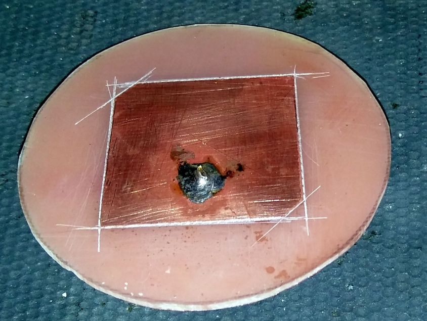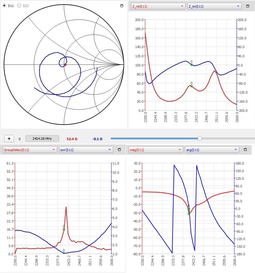 dem Aufsatz von Gunthard Kraus folgend, habe ich mit den Patchantennen ein wenig experimentiert. Meine Schlussfolgerung ist, dass sich Platinenmaterial für eine Patchantenne nur eingeschränkt eignet. Die Abmessungen werden so klein, dass man mit einer feinen Nadel die Ätzkante der Platine (hier 30 x 30mm) zum Abgleich immer nacharbeiten muss. Die Antenne ist exrem schmalbandig, sodass die beiden Peaks fast auf einer Frequenz zusammen fallen. Damit ist die Erzeugung einer zirkularen Polarisation höchst ungewiss. Man benötigt auf jeden Fall einen VNA. Aus Kostengründen habe ich in China einen SAA2 bestellt, mit dem man sich auch behelfen kann.