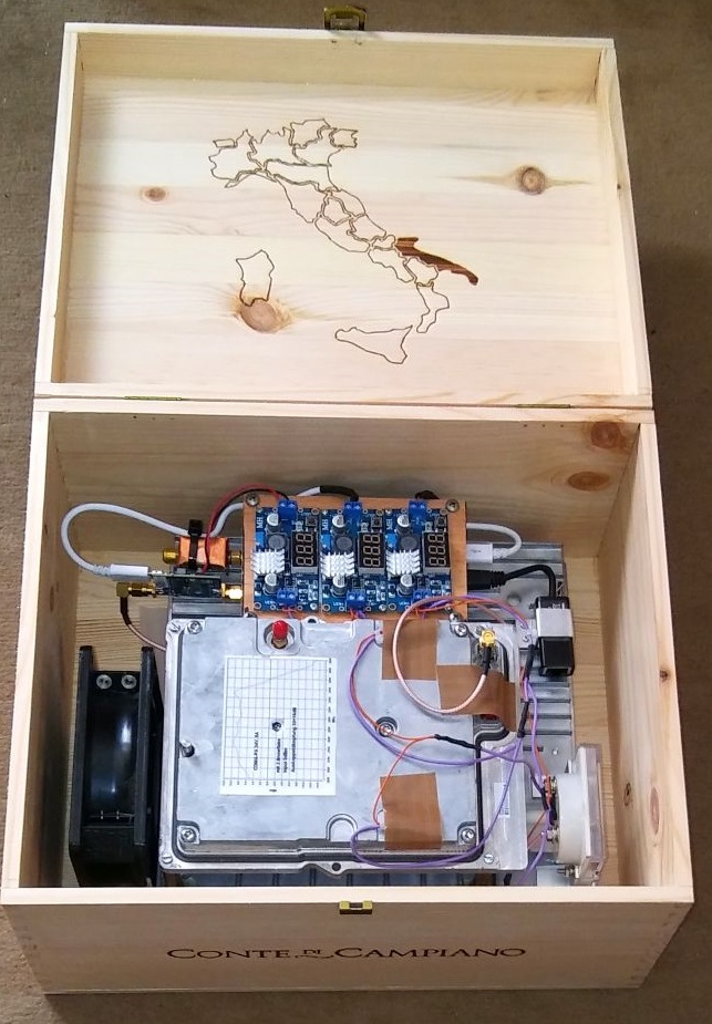 Nachtrag 3 vom 13./18.09.2020: Das Aircell7 wurde durch RG142 aus Teflon ohne Verwendung von Adaptern ersetzt, nachdem sich durch Hitze eine Abschirmung im Stecker verabschiedet hat. Rein zufällig fand sich eine passende 6-Flaschen-Weinkiste aus Italien für den Transport der mobilen Anlage. Dazu gekommen ist noch eine ICY-Box zum Anschluss eines Netzwerkkabels für abgesetzten Betrieb.