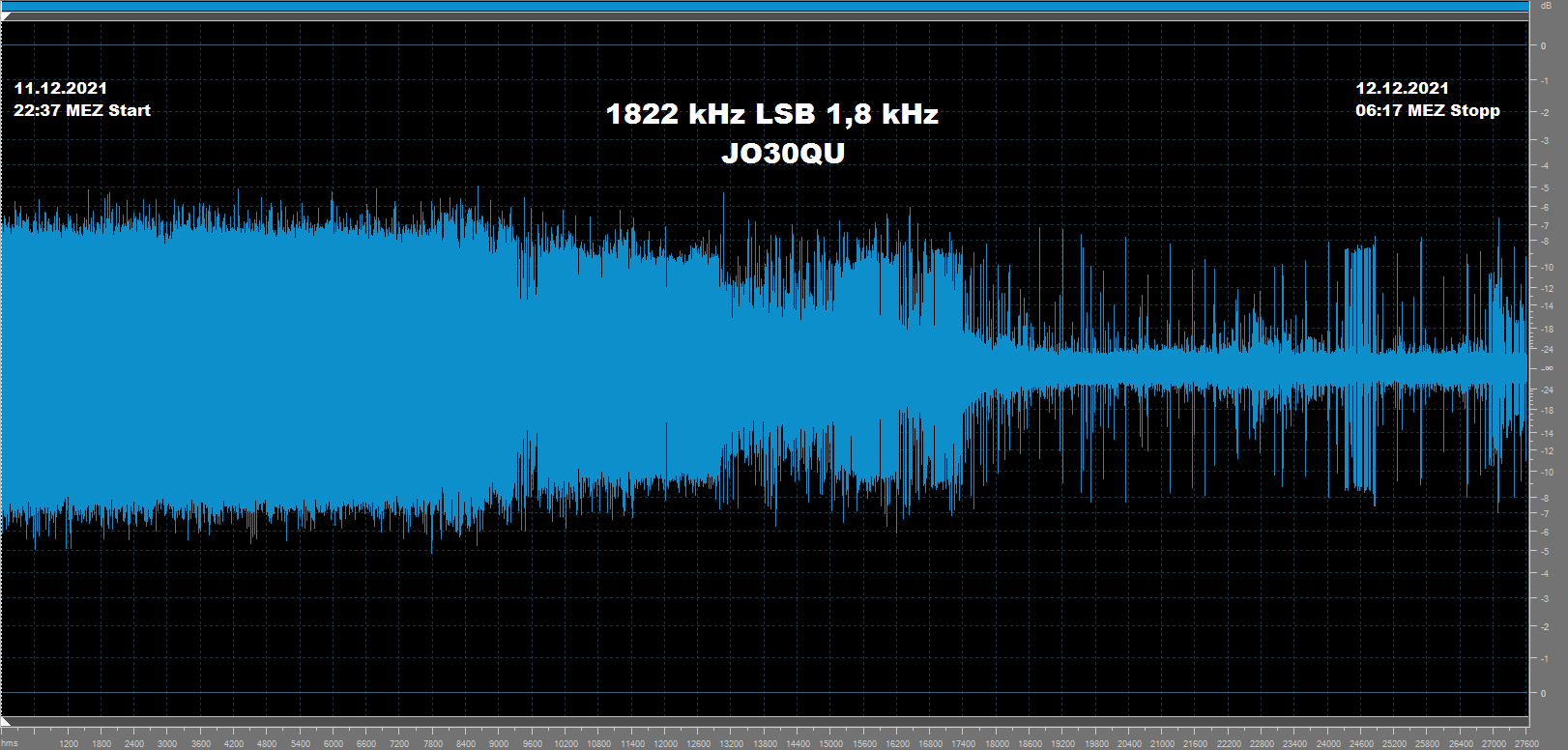 ich habe inzwischen meine mp3-Aufzeichnung vom 12.12.2021 auf 1821 kHz (1822 LSB, 1,8kHz Bandbreite, 8m Vertikal) trotz der Pleite von W2AN/1BCG ausgewertet und kam zu folgendem Ergebnis: