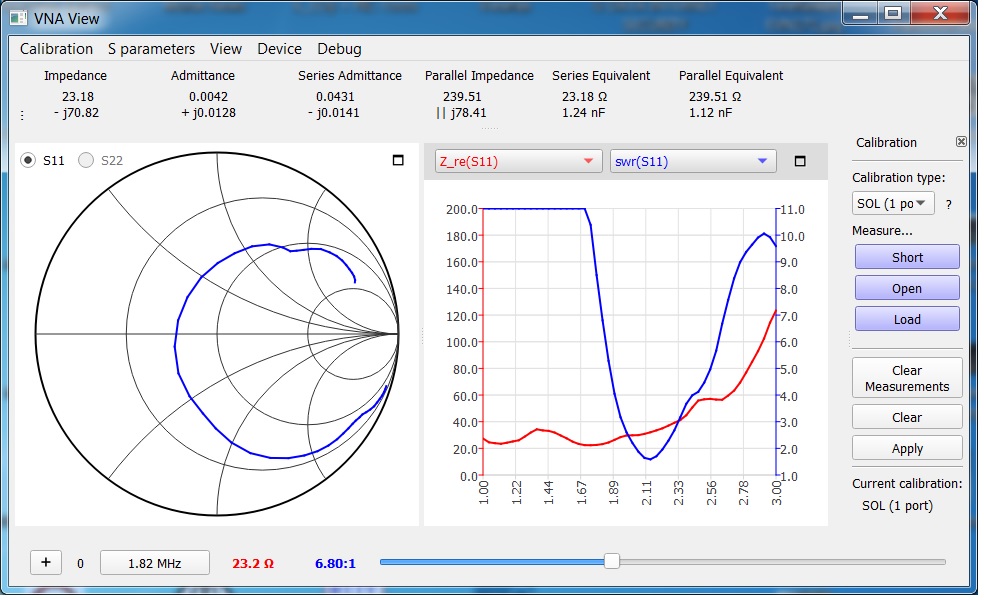 Der rechnerische Strahlungswiderstand liegt bei 2,4 Ohm, sodass ich von einem Wirkungsgrad von ca. 10% ausgehen muss. Die Dachkapazität beträgt 409 pF und die Kapazität zwischen den Hühnerleitern 172 pF.