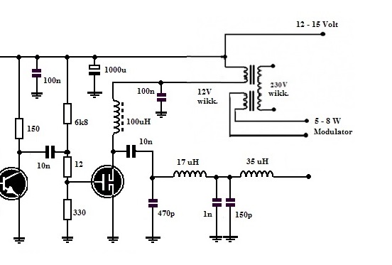 Die 100µH Drossel verhindert, das die Hochfrequenz zur Betriebsspannung hin abfließt, die 17µH und 35µH Drosseln bilden zusammen mit den Kondensatoren nach Masse das Ausgangs /Anpassfilter soweit ist das klar.