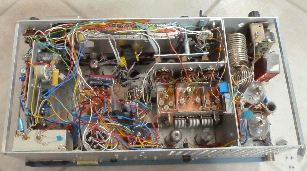 Links ist der NF-Verstärker mit dem CW-Filter (die abgeschirmte Spule mit dem gelben Kondensator), rechts daneben die ECL82 und oben in der Mitte im Abschirmgehäuse des Mikrocontrollers. Rechts vom Mikrocontroller ist die Mechanik der Empfangs-Bandumschaltung zu sehen, darunter die Empfangsfilter mit den vielen Trimmkondensatoren. Unter dem Filter sind die beiden Dreifach-Drehkos, der für den Sendepfad ist unten zu sehen. Knapp erkennbar unter der Mechanik sind die beiden EF183 für den HF-Vorverstärker und unten die EF183 und EL84 für den Sendepfad.