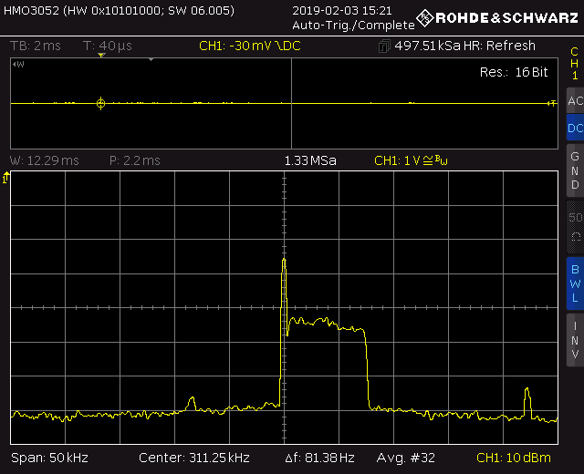 Als Modulationssignal dient das Rauschen vom offenen Analogeingang, der so alle Störungen in der Umgebung aufnimmt. Durch das sehr steilflankige SSB-Filter existiert vom unteren Seitenband nichts. In der Praxis wird der Durchlassbereich noch etwas nach oben verschoben, da die NF-Frequenzen unterhalb 300Hz für die Verständlichkeit eher schaden als nützen, zudem reicht eine Bandbreite von 3kHz. Da die Modulation in der digitalen Ebene erfolgt, wird auch der Träger vollständig unterdrückt, ausser man lässt ihn gewollt durch, so wie hier. Für CW wird der Träger in die Mitte des Durchlassbereichs vom SSB-Filter gesetzt und getastet, so gibt es gratis eine Bandbreitenbeschränkung, so dass die Tastung nicht 'hart' ist und man nicht das ganze Band 'zunagelt'.
