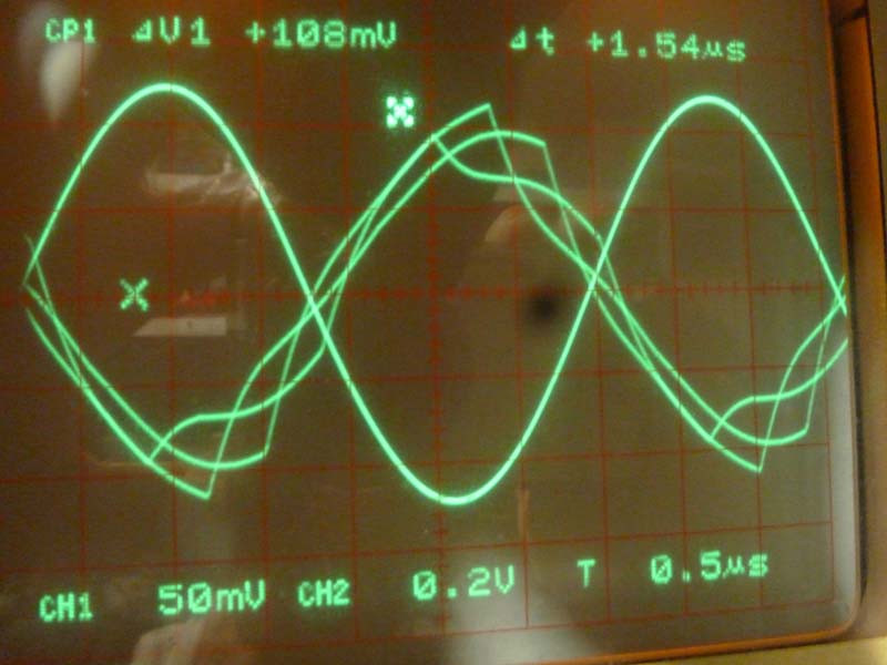 Das Signal mit den Ecken ist das ungefilterte Signal vom D/A-Wandler, und wegen dem 'krummen' Verhältnis zwischen Ausgangsfrequenz und Samplingfrequenz sind die 'Ecken' nicht immer bei denselben Momentanwerten, was zu mehreren Signalkurven führt. Das gefilterte Signal ist ein sauberer Sinus, so wie es sein soll.