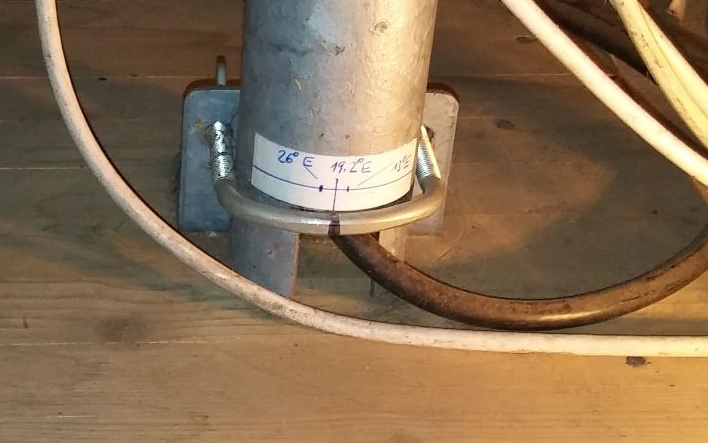 Es sollte vor dem Abriss die Antenne mit einer Rohrzange unter Dach auf die Position 26 Grad Ost verdreht und Empfangsversuche angestellt werden. Der 90 cm Parabol stammt aus dem Jahr 1985 und war ursprünglich auf die Position 13 Grad Ost und Eutelsat-1-F1 ausgerichtet gewesen. Die Elevation sollte erst einmal nicht geändert werden.