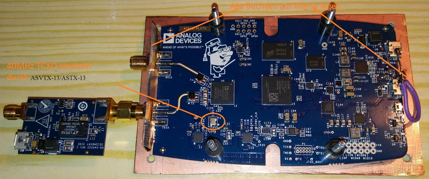 1. Alle Ein- und Ausgangsbuchsen auf möglichst kurzen Weg auf Masse legen 2. Austausch des frequenzinstabilen TCXO gegen eine bessere Type (in meinem Foto beschrieben)