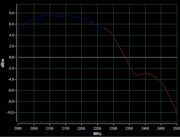 Die Bodenkontrollstation der Sternwarte Bochum hat eine Leistungsbegrenzung zum Schutz des Transponders eingeführt, die "LEILA" heisst. Sobald man einen Höchstpegel erreicht, wird die eigene Aussendung mit einem umgetasteten Trägersignal belegt. In meiner Unkenntnis habe ich Leila bereits zweimal aktiviert, und das trotz der fast um 11dB geringeren Verstärkung durch den Pegelabfall im Frequenzgang bei 2400 MHz. Damit bleibt der Verstärker erst einmal unverändert. Bei einer Entnahme des CN0417 Treibers (20dB) wäre nach Korrektur des Frequenzgang eine Vollaussteuerung bei schlechtem Wetter nicht gewährleistet.