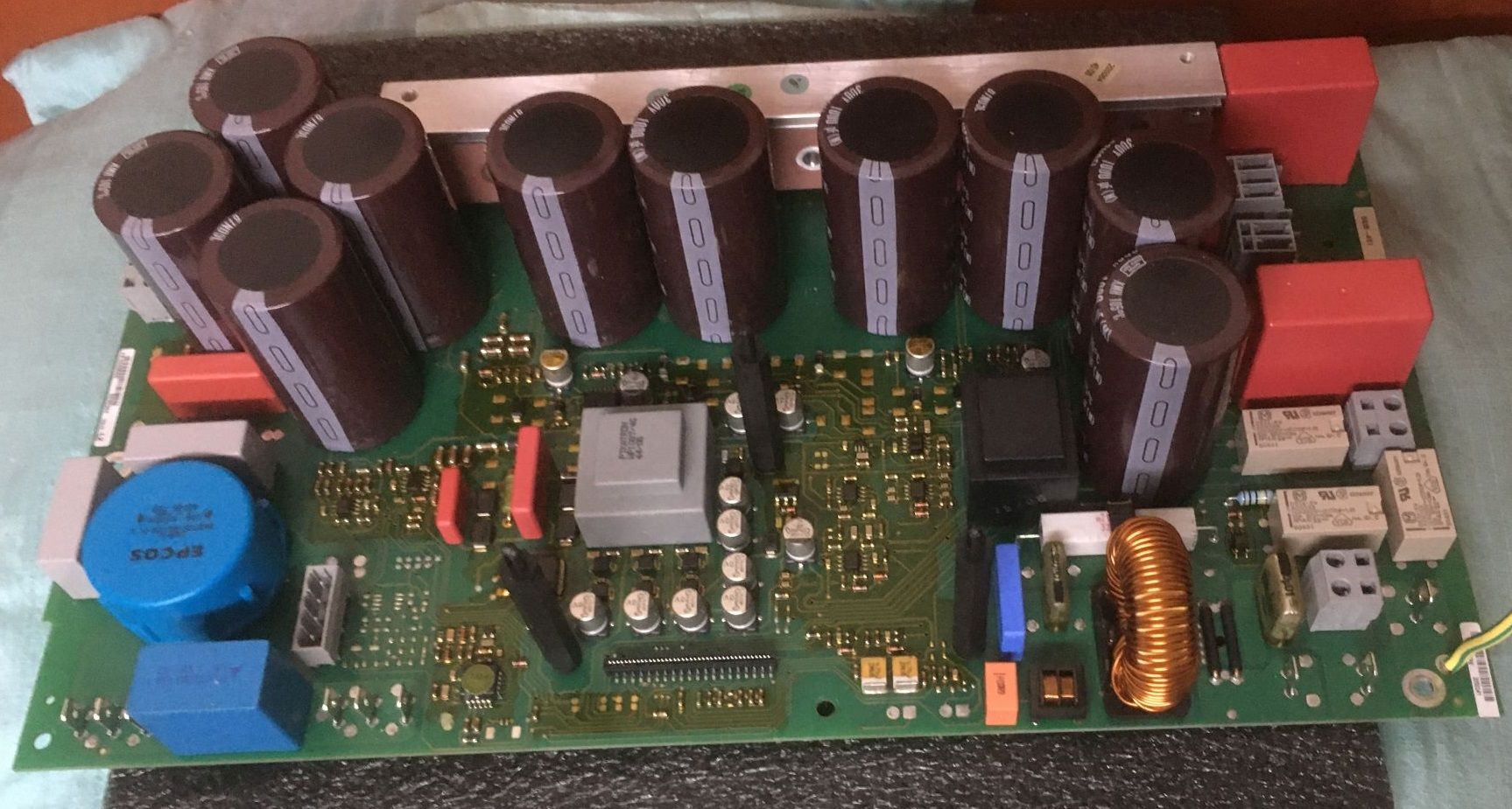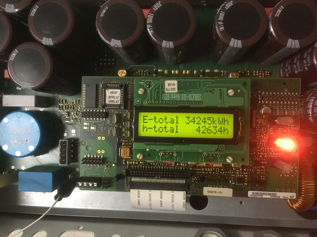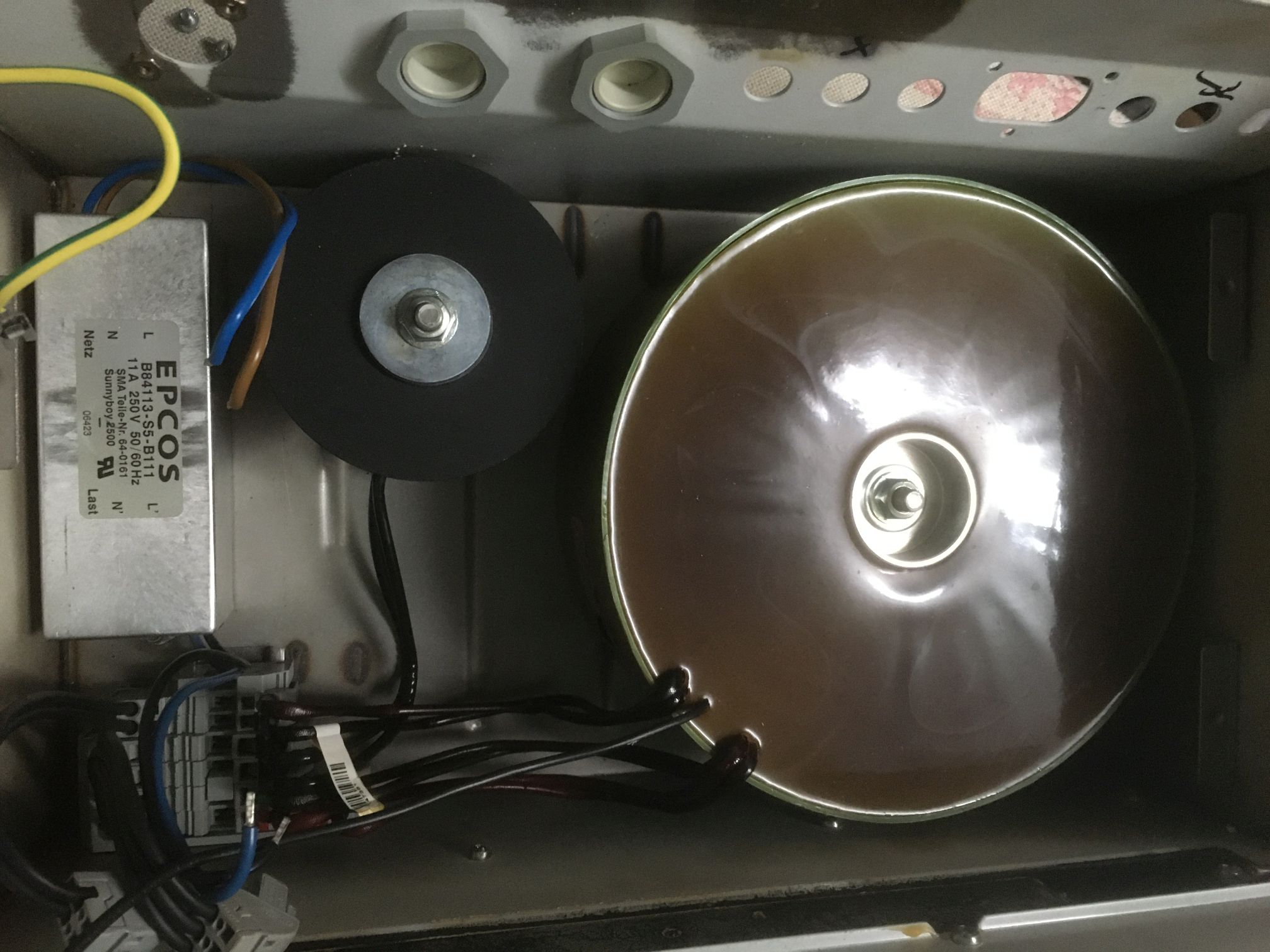 Nun gibt es PV-Anlagen seit gut 30 Jahren. Die ersten Trafowechsel- richter des Marktführers waren 30kg schwer und schirmten sowohl den Ringkerntrafo als auch die Inverter-Induktivität in einer in sich geschirmten Abteilung. Folgendes Bild entstand vor wenigen Wochen. Es handelt sich um einen SB2500, der nach Tausch des 15A-Stromsensors wieder vollständig funktionierte: